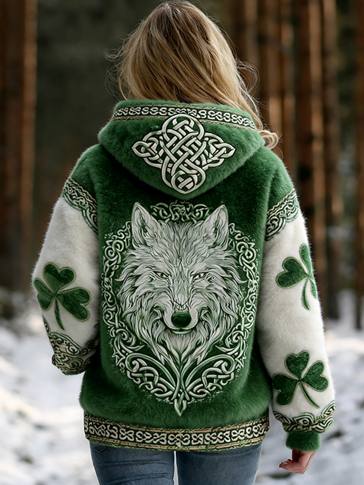 Women's St. Patrick's Day Clover With Wolf Print Zipper Flannel Hoodie