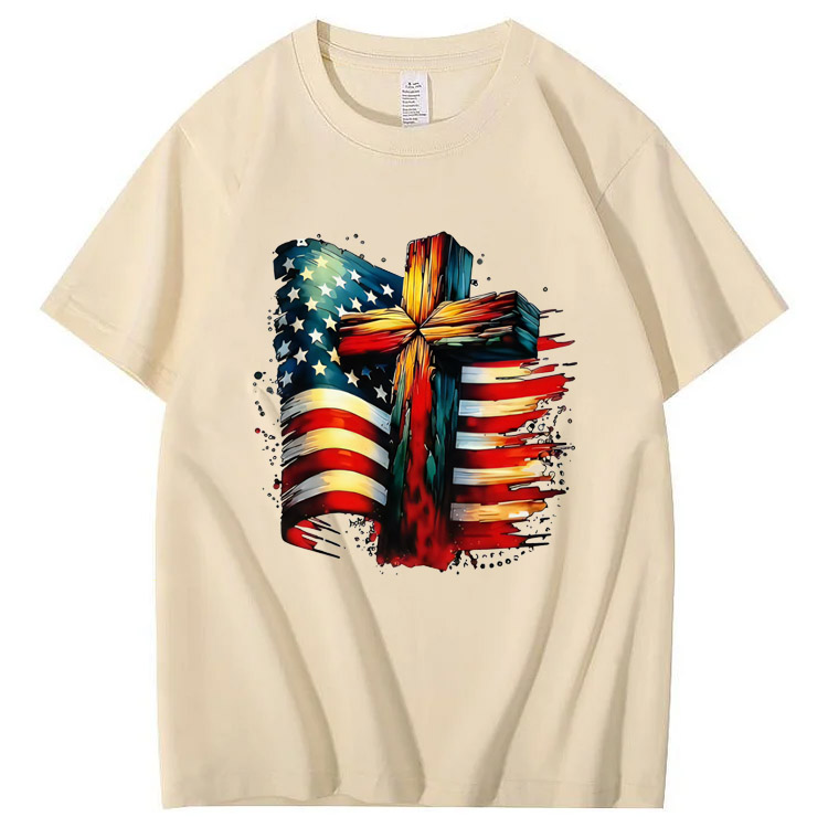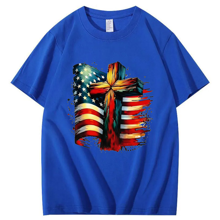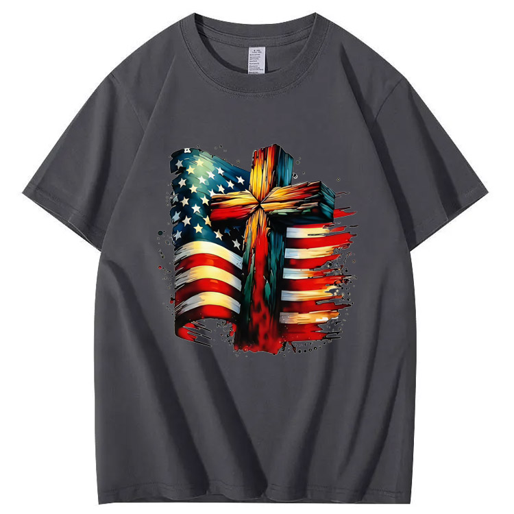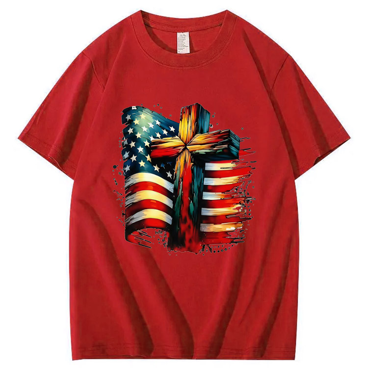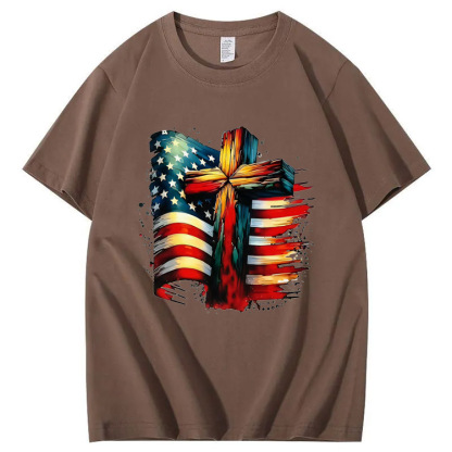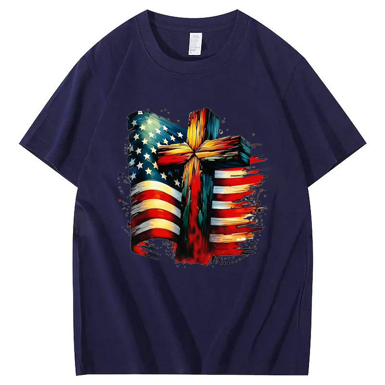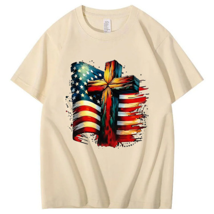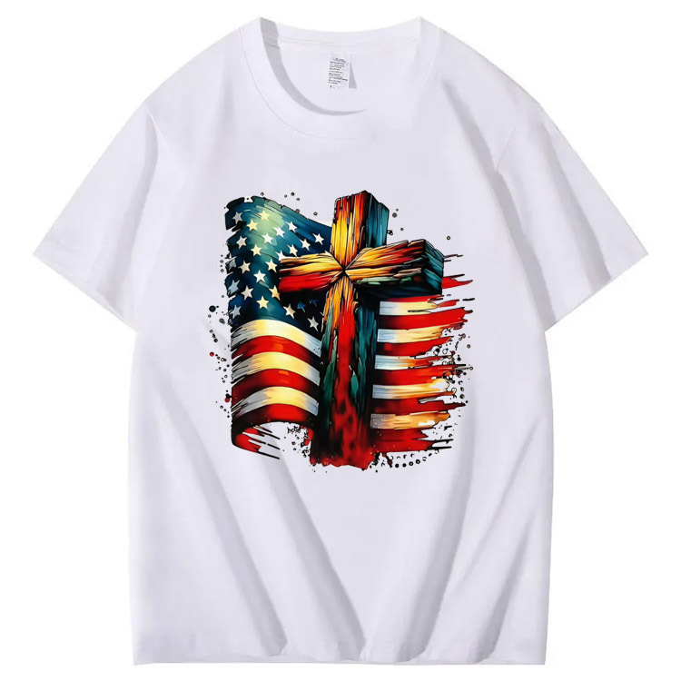 American Flag And Cross Pattern Print 100%Cotton T-Shirt
