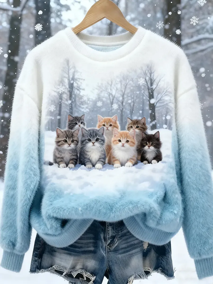 Christmas Cute Cat Art Print Casual Plush Sweatshirt