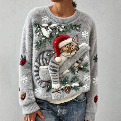 Christmas Lazy Cat Women's Cozy Plush Sweater
