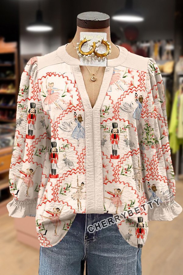 Christmas Nutcracker Print Cuff Sleeve Top