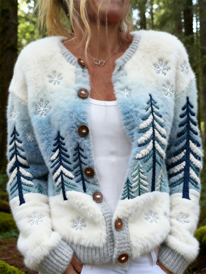 Christmas Snow Scene Forest Women's Knit Cardigan