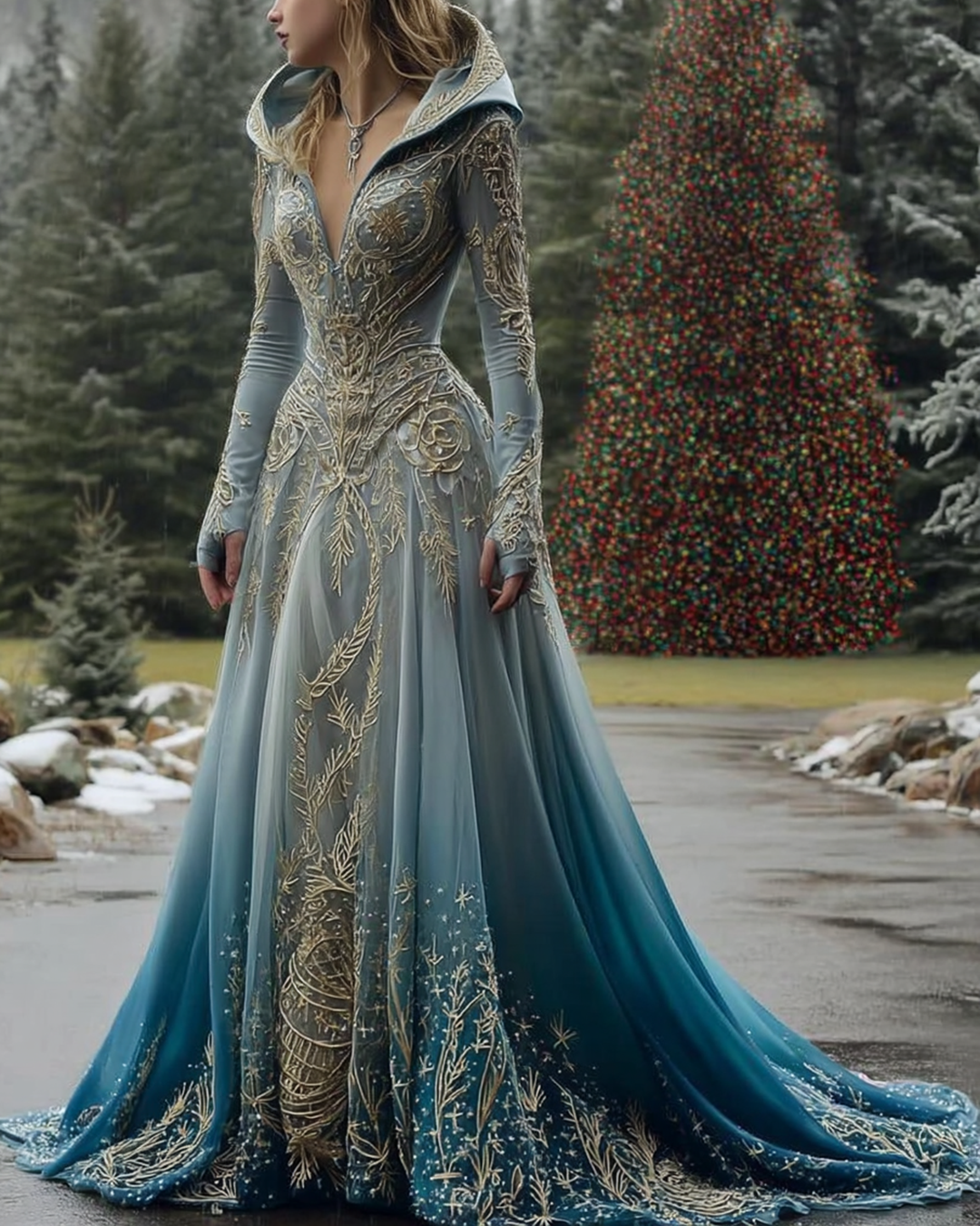 Christmas Themed Gradient Snowflakes Embroidered Hooded Dress 9868