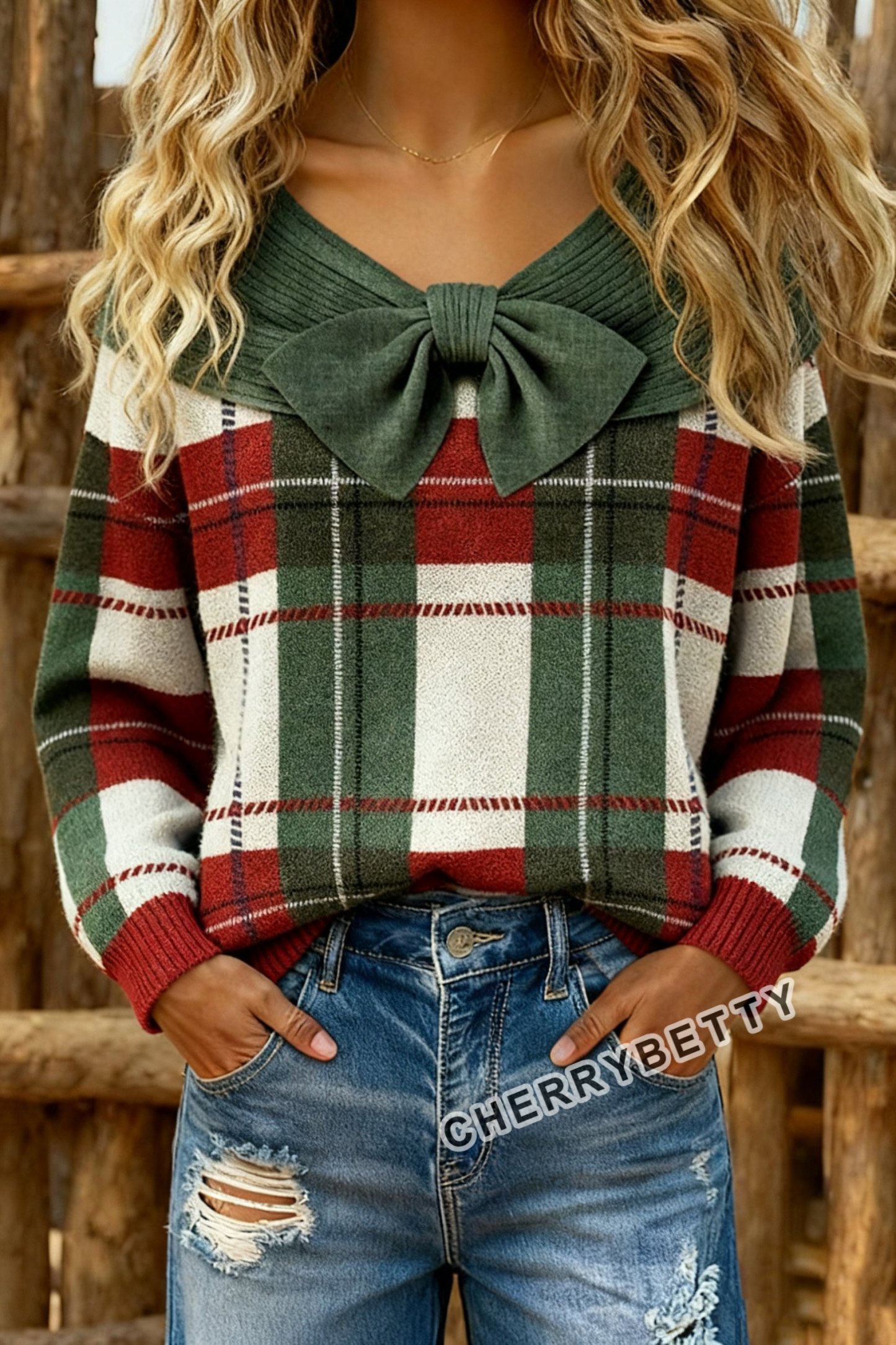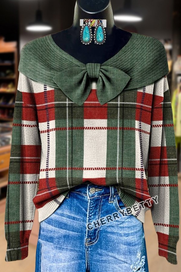 Classic Checkered Bow Detailed Long Sleeve Sweater