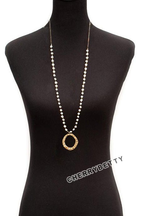 Gold Chain Beaded Pearl Necklace With Round Metal Pendant