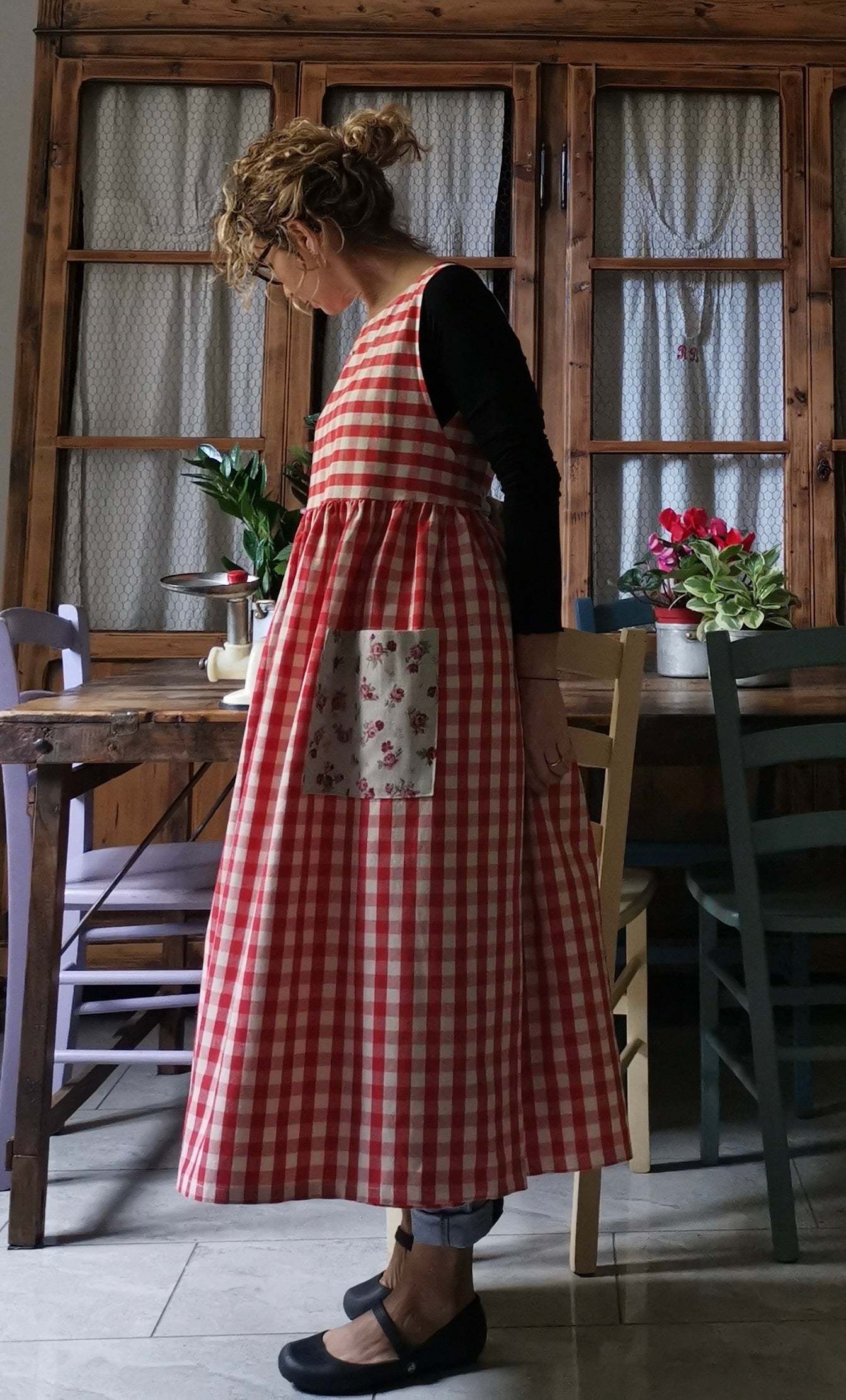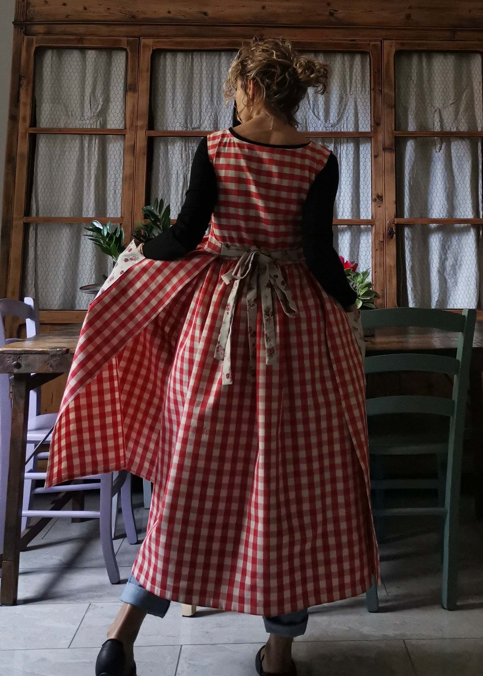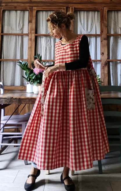 Red Plaid Cotton Apron with Floral Pocket