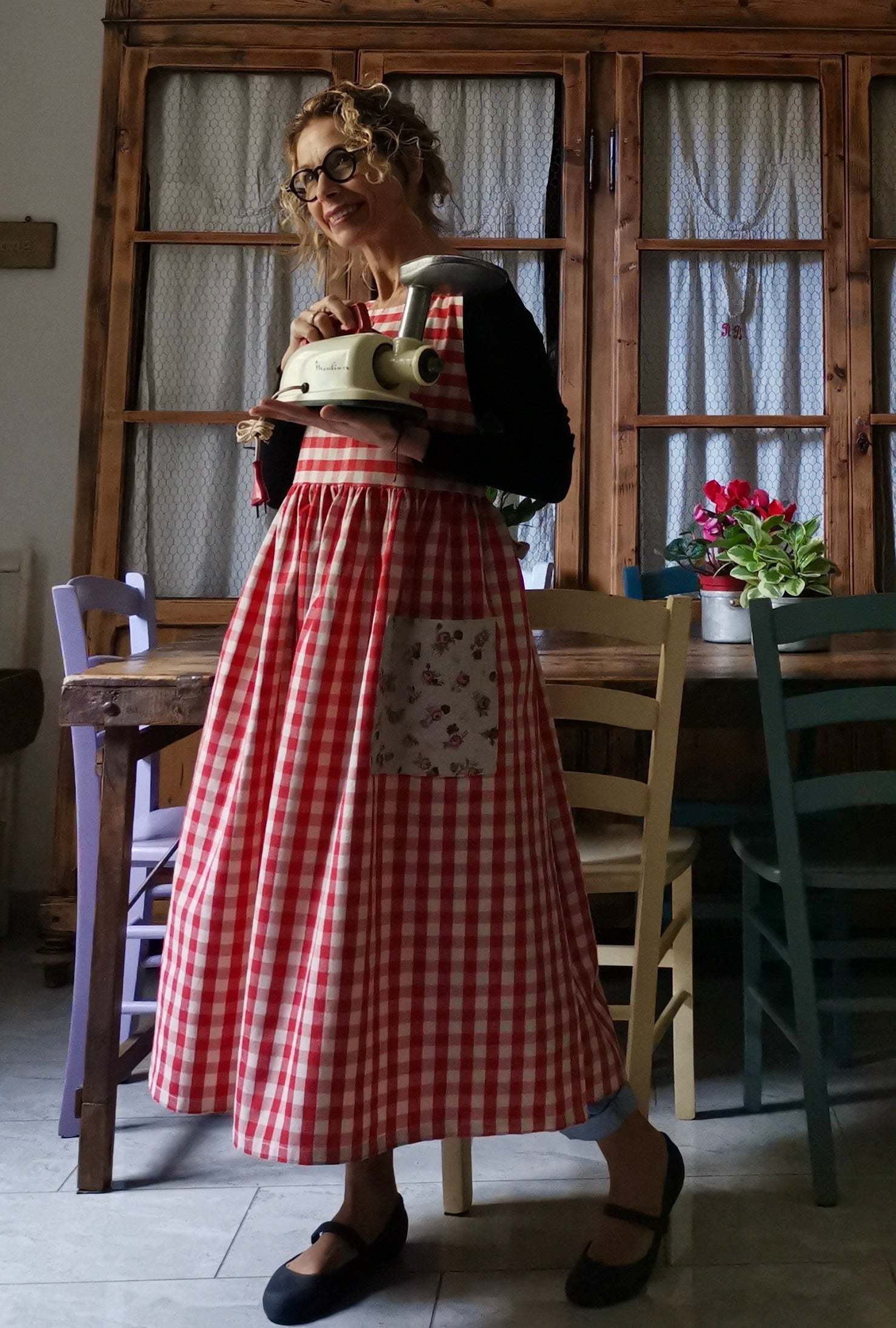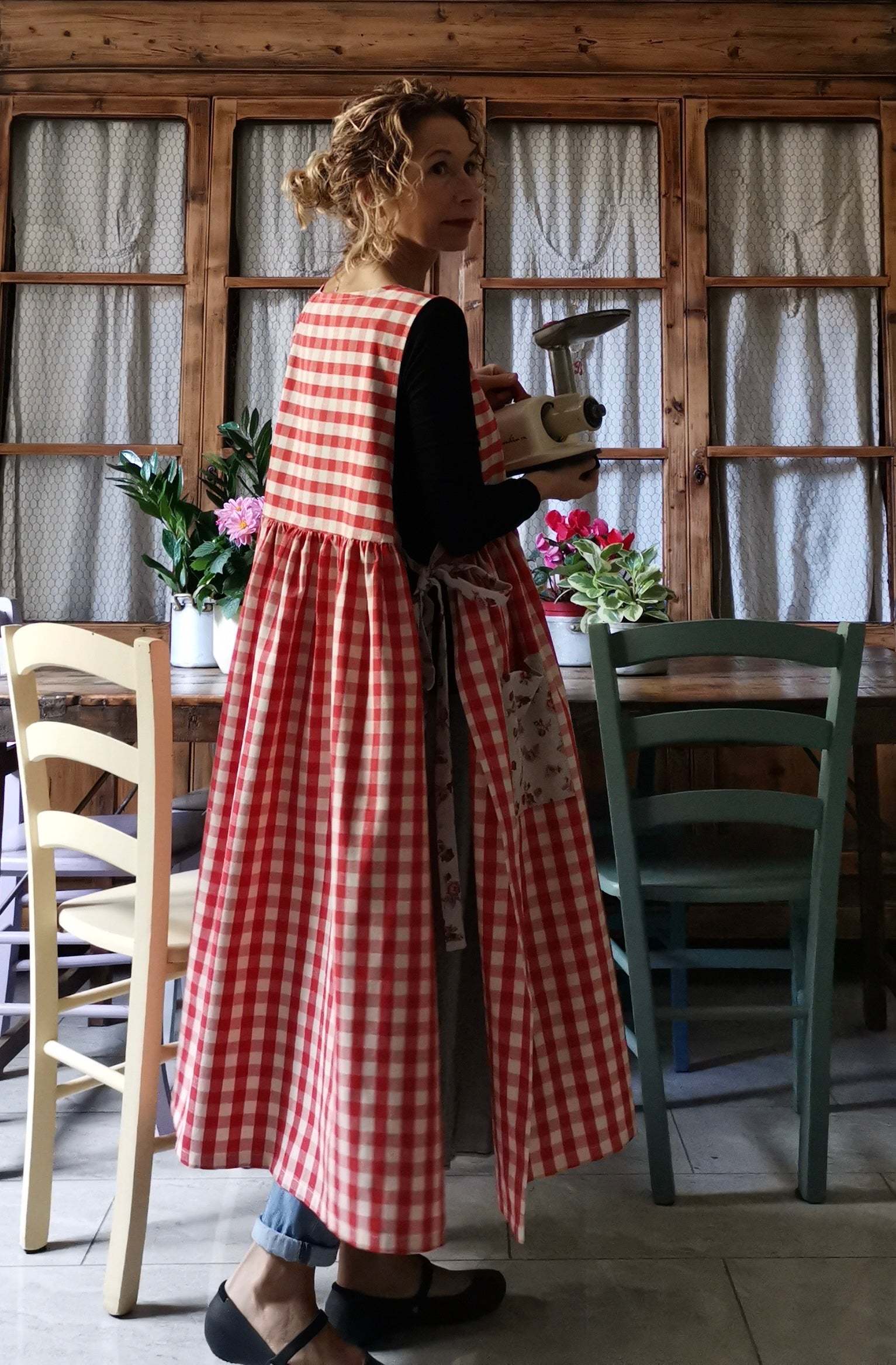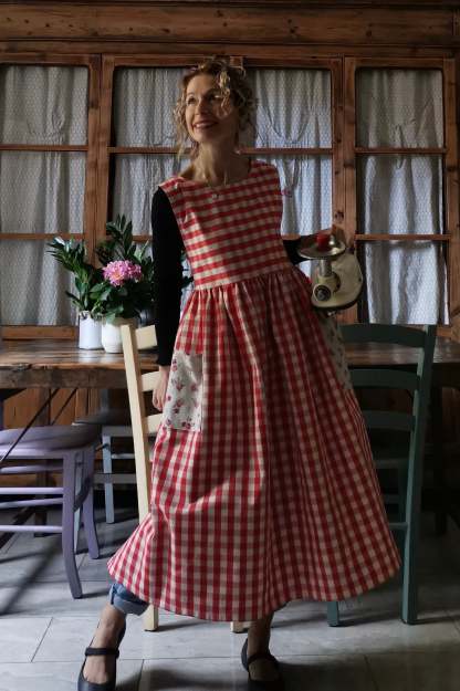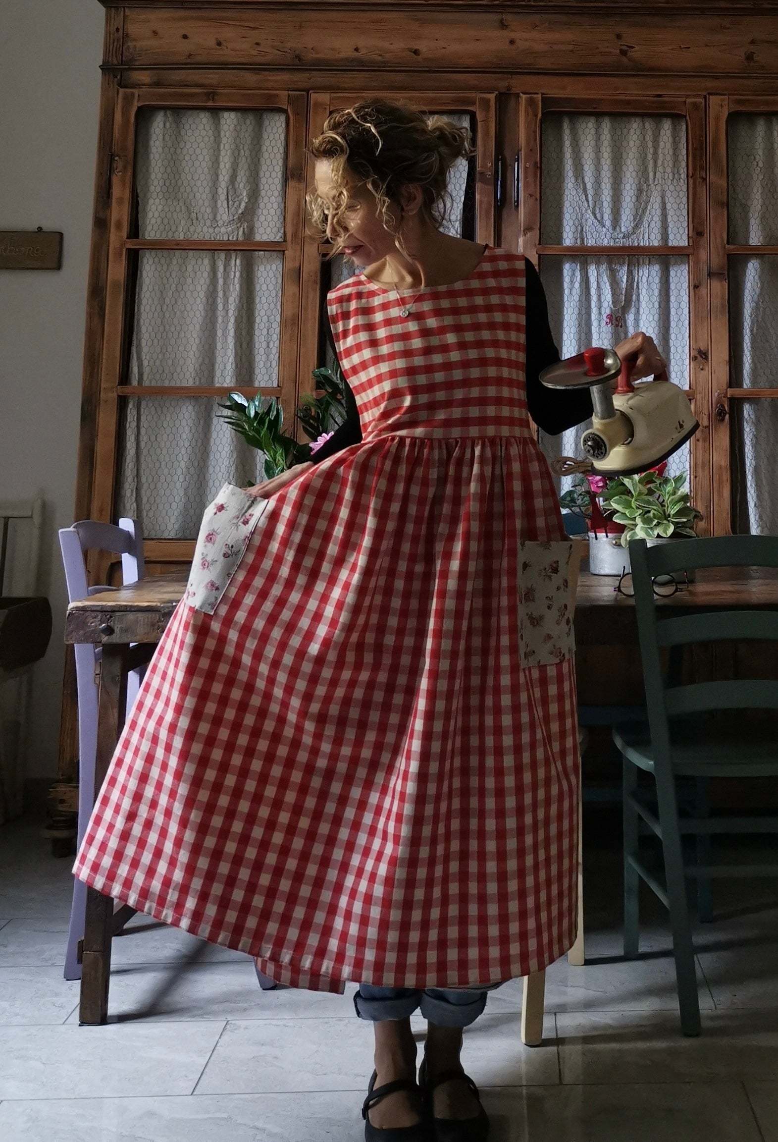 Red Plaid Cotton Apron with Floral Pocket