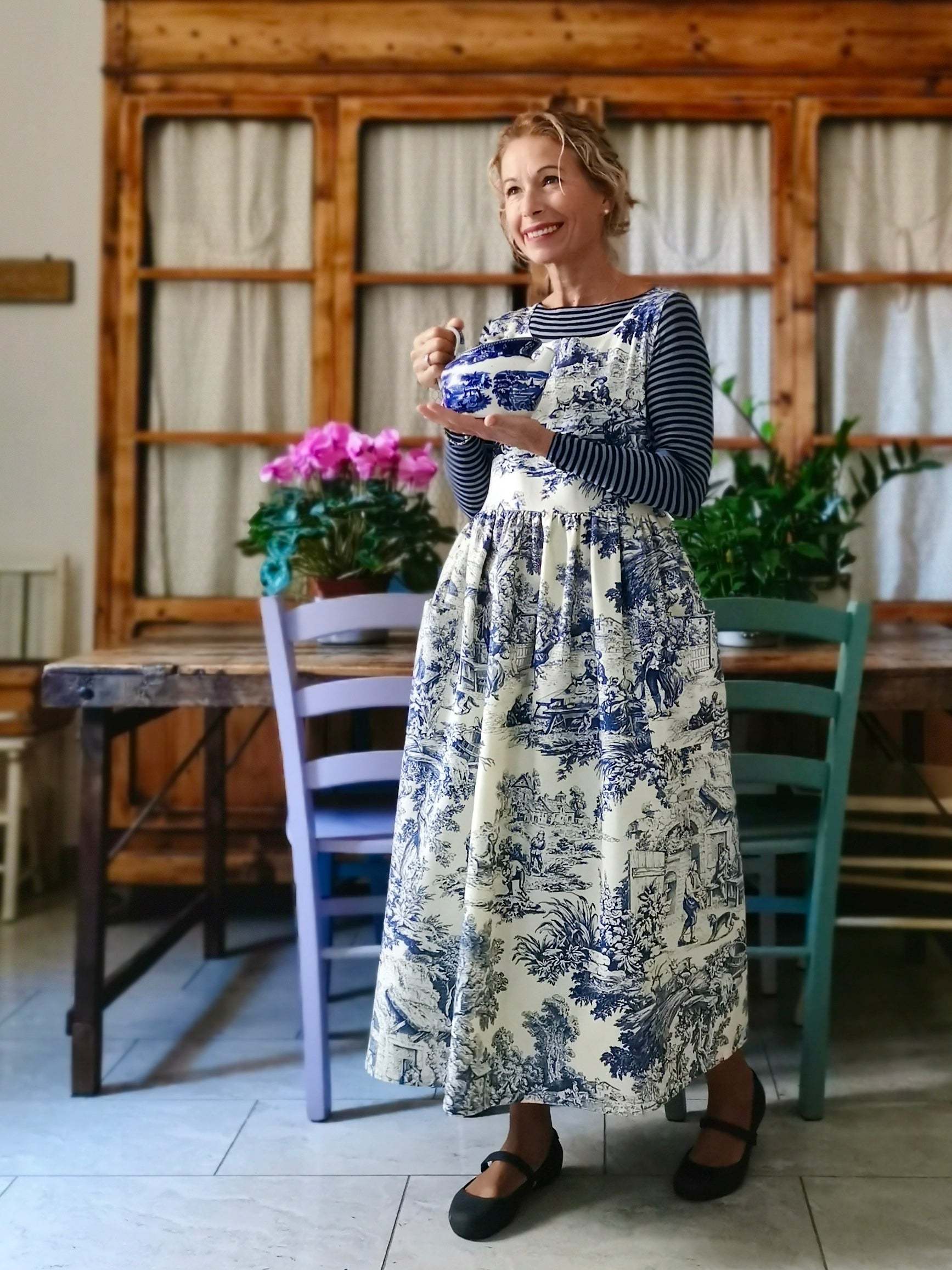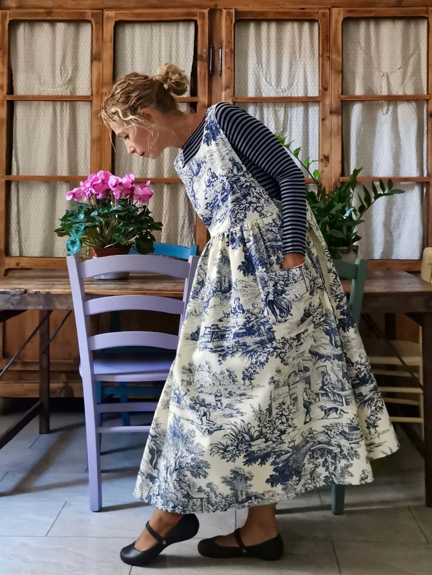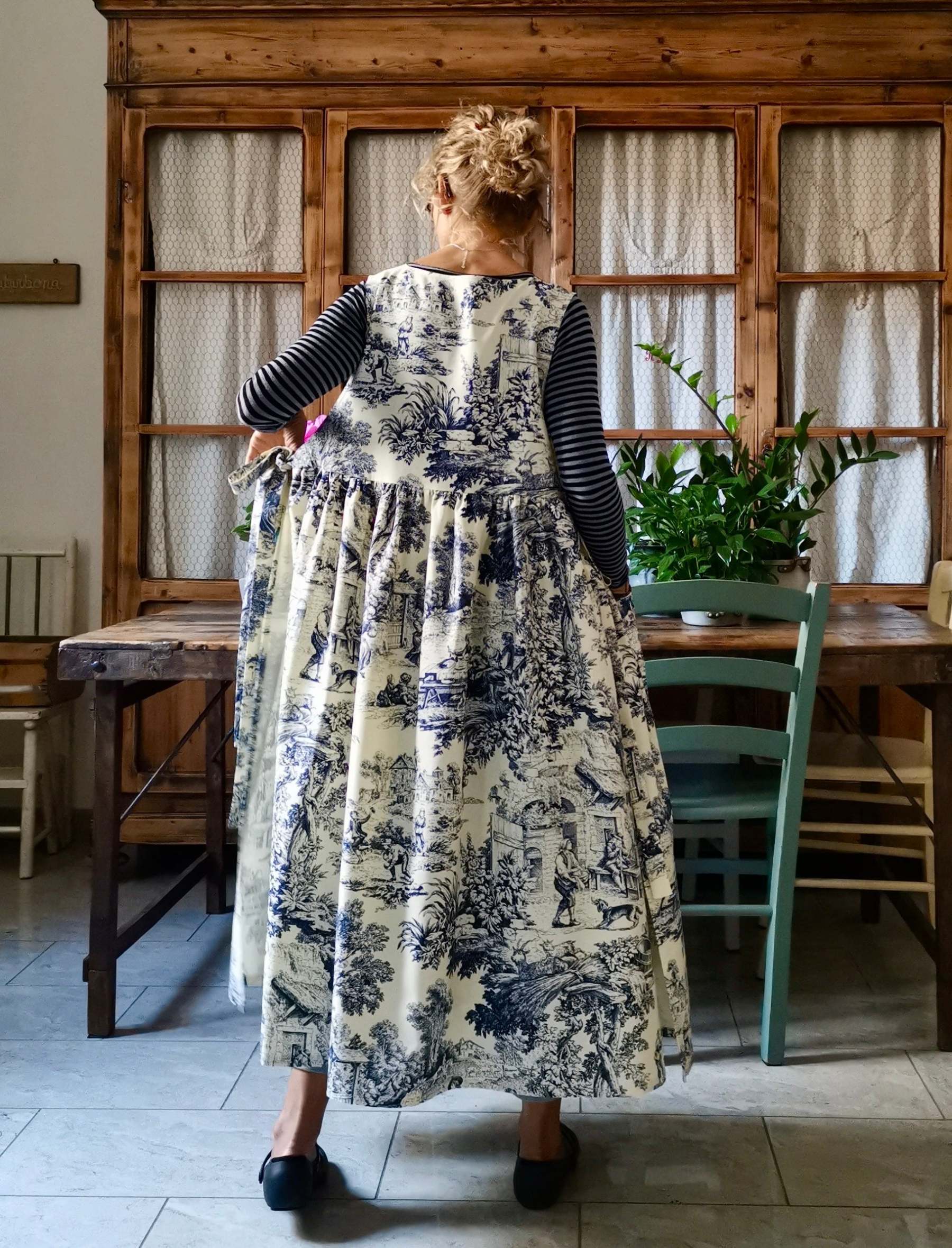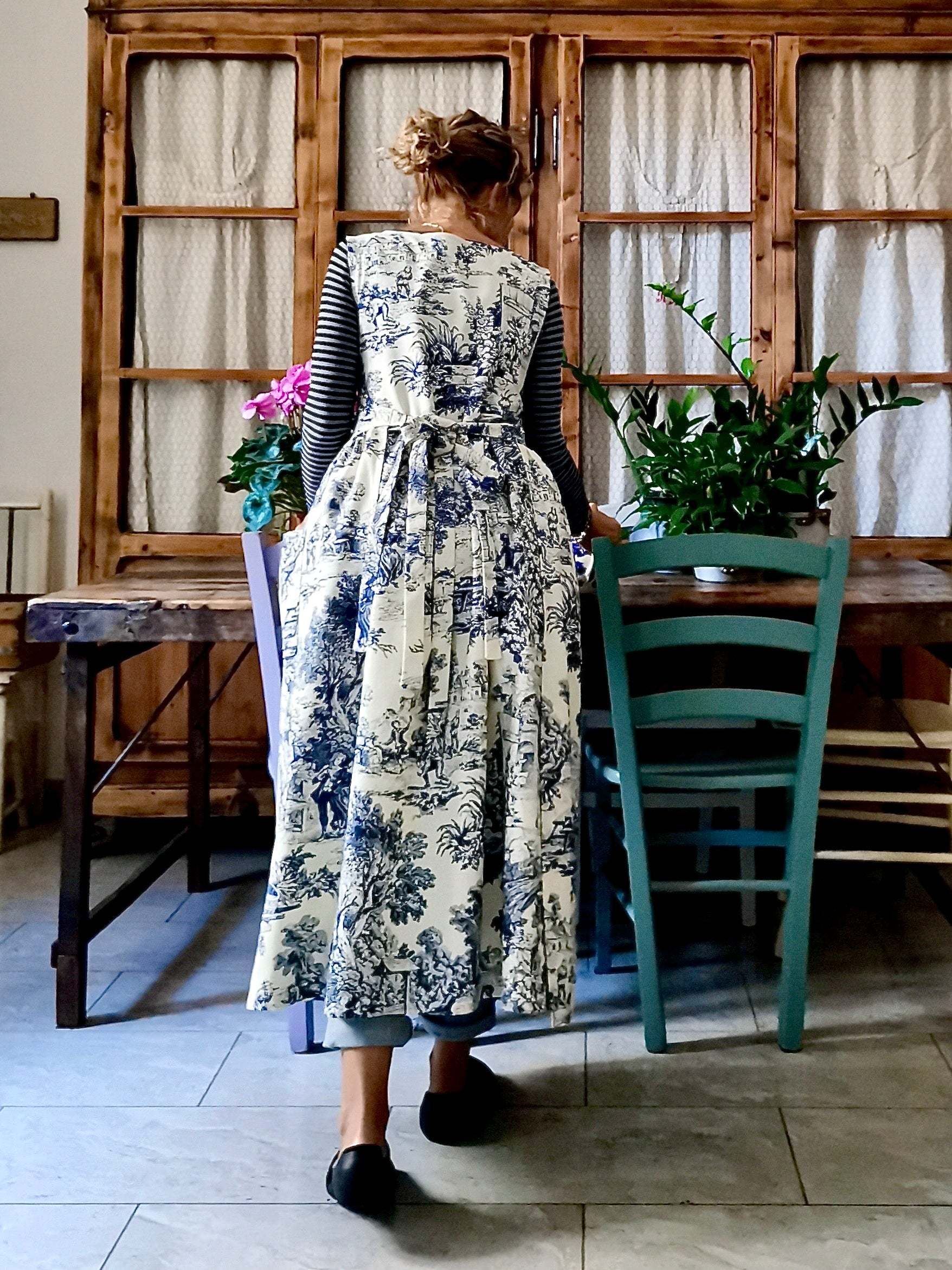 Vintage Toile de Jouy Blue & White Long Apron with Pockets