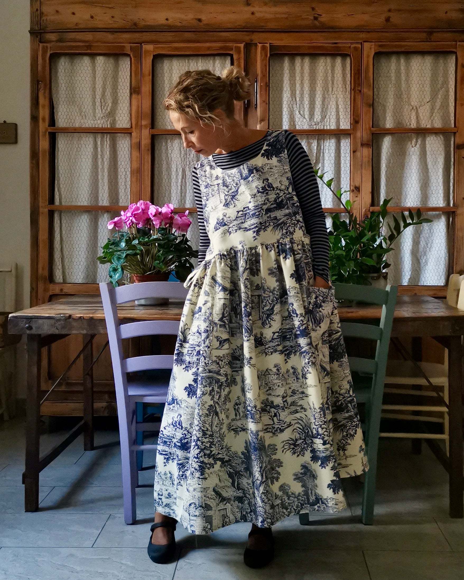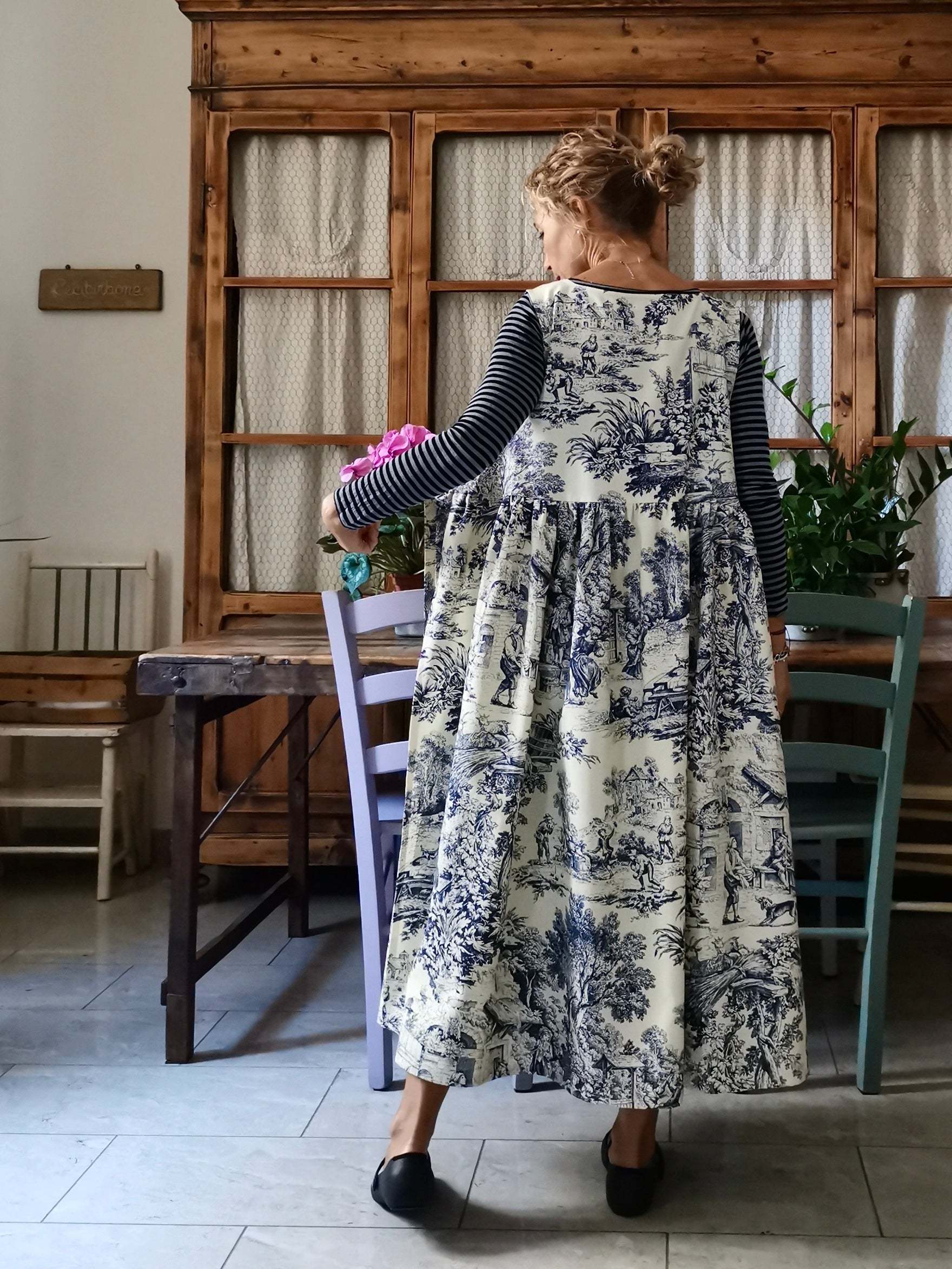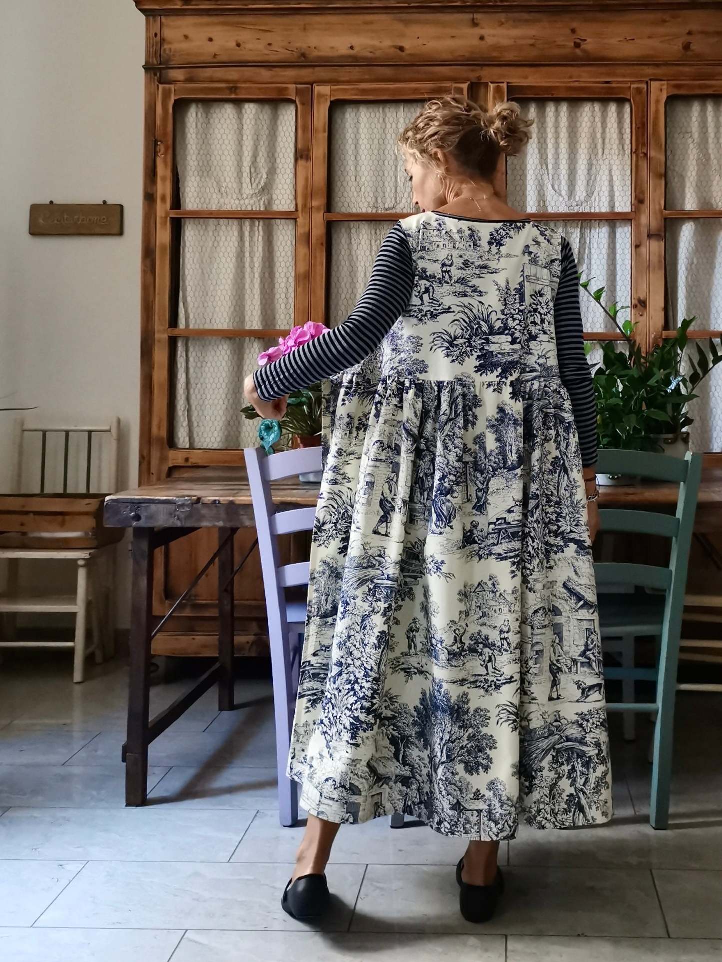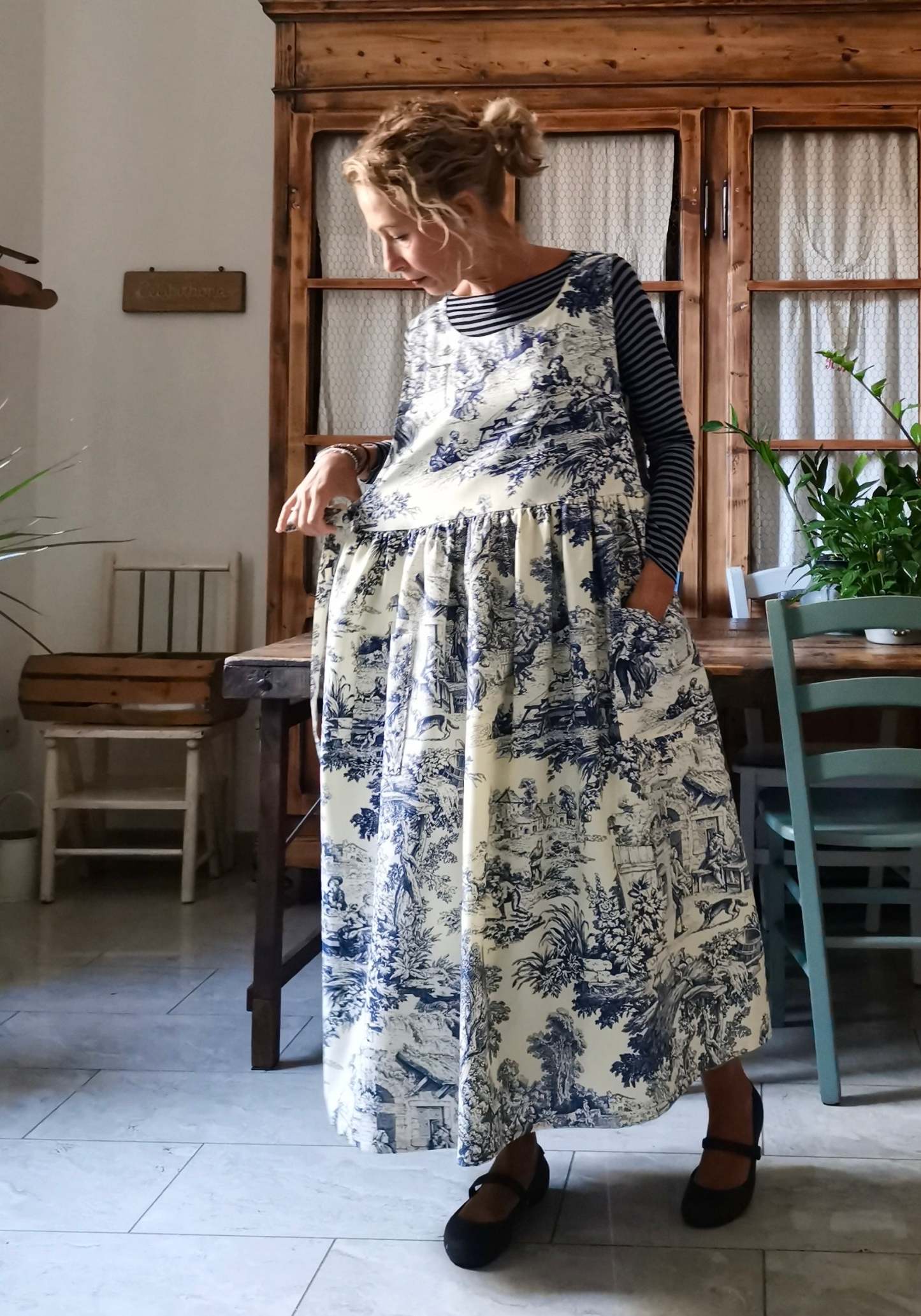 Vintage Toile de Jouy Blue & White Long Apron with Pockets