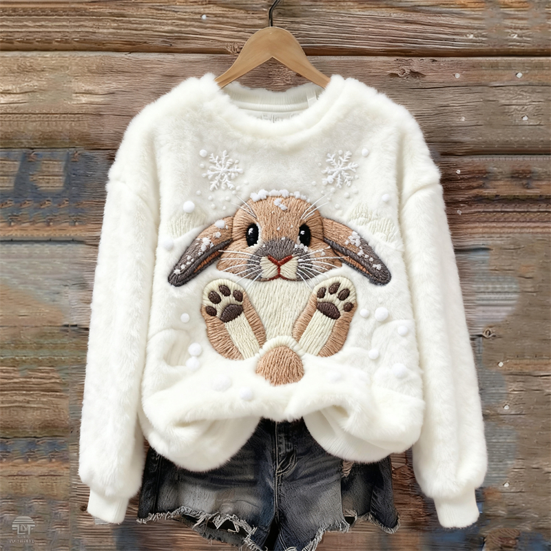 Lovely Bunny & Snow Embroidered Cozy Plush Sweatshirt