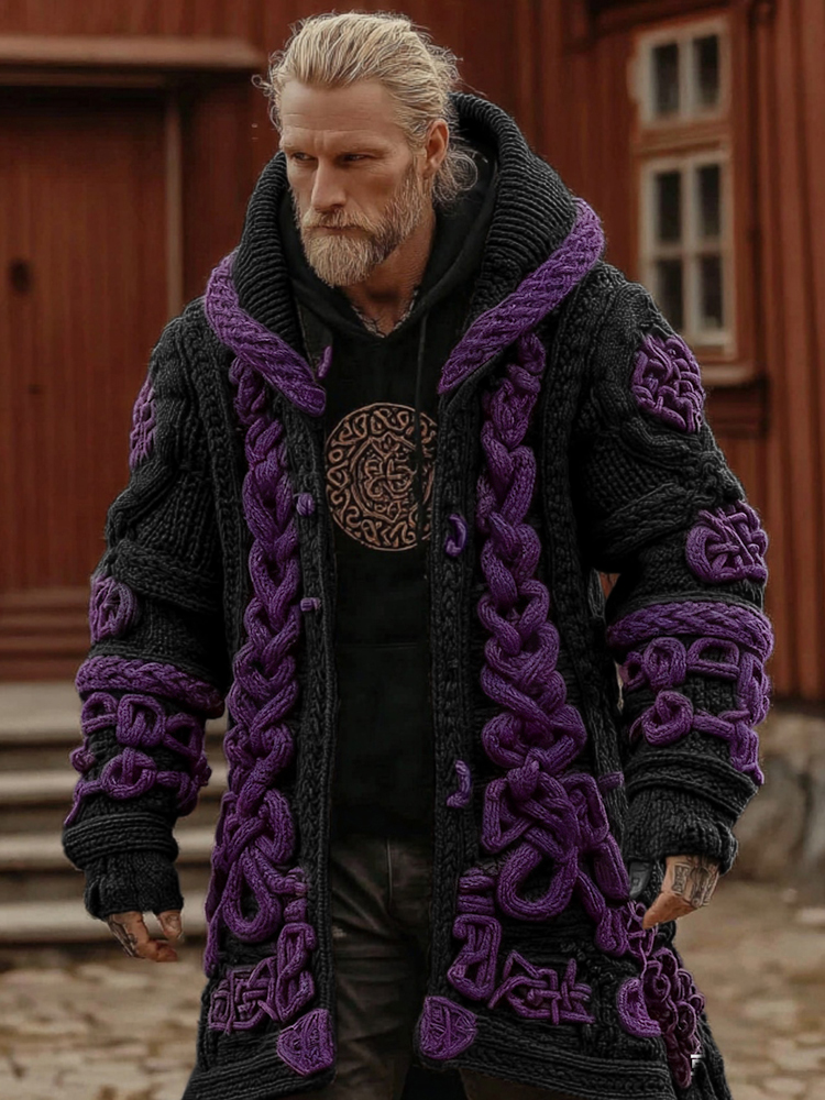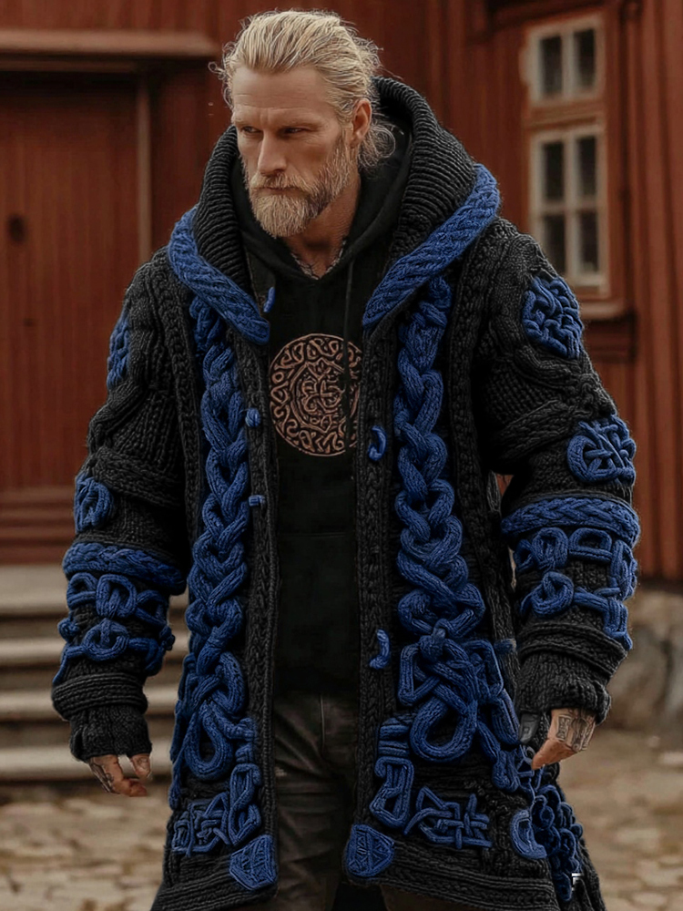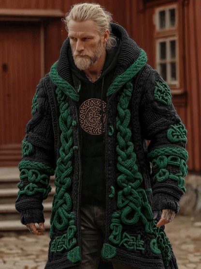 Men's Viking Celtic Geometry Pattern Art Knitted Hooded Cardigan