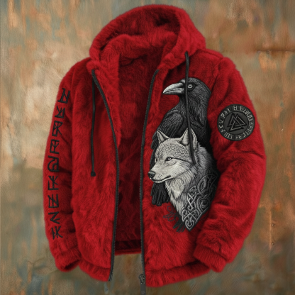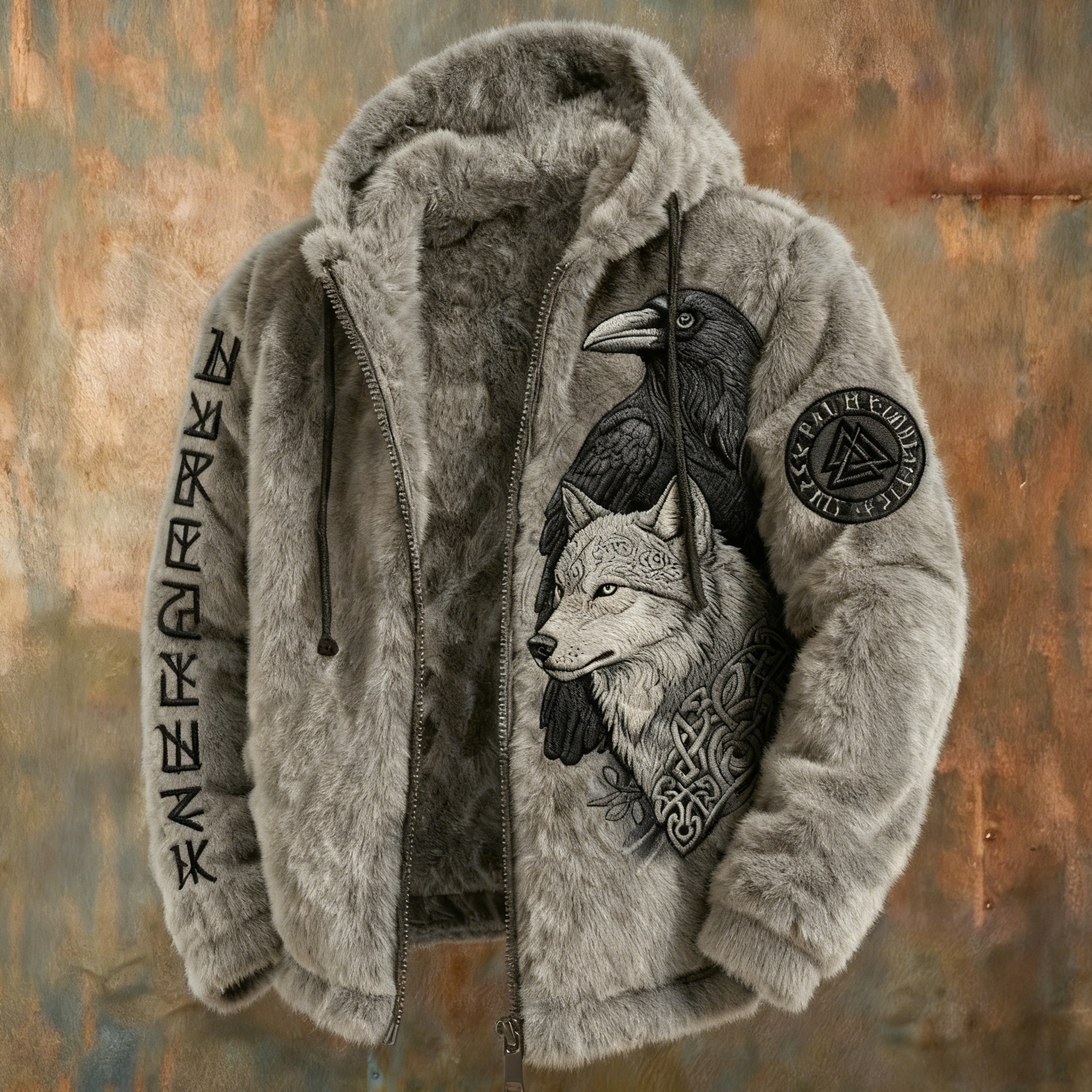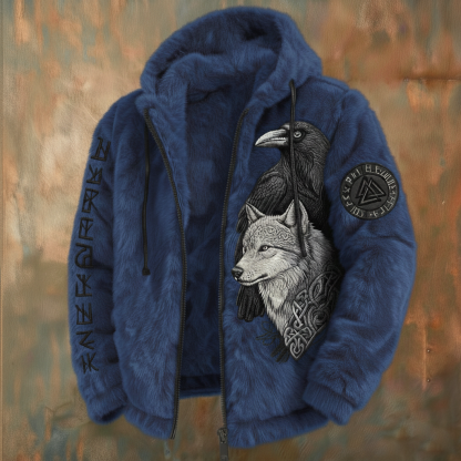 Men's Viking Tribal Jacquard Celtic With Crows & Wolves Inspired Plush Warm Zipped Hooded Jacket