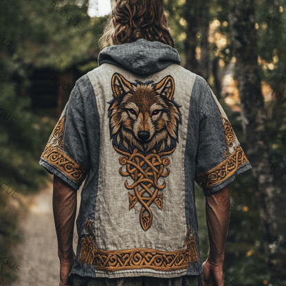 Men's Viking Tribal Print Wolf Print Art Pattern Linen Short Sleeve Hoodie