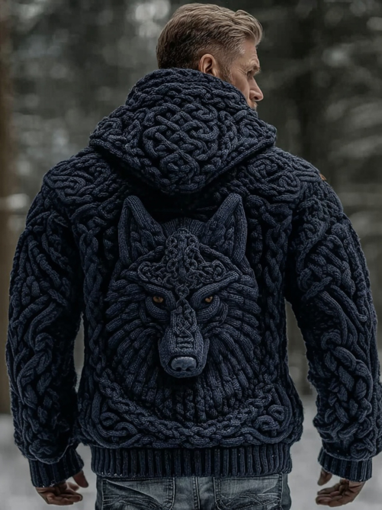 Men's Viking Wolf Totem Chunky Knit Hooded Cardigan