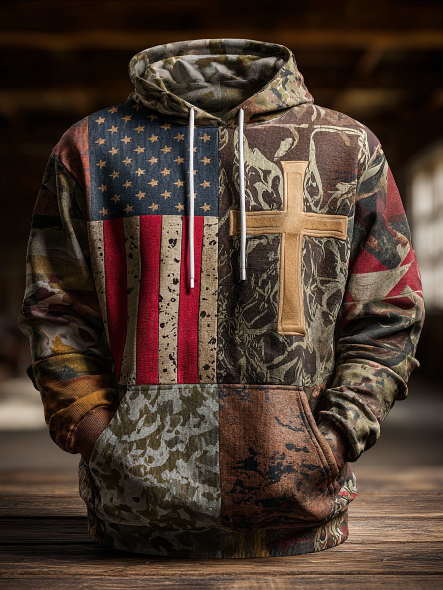 Men's Vintage Casual American Flag Cross Faith Hoodie
