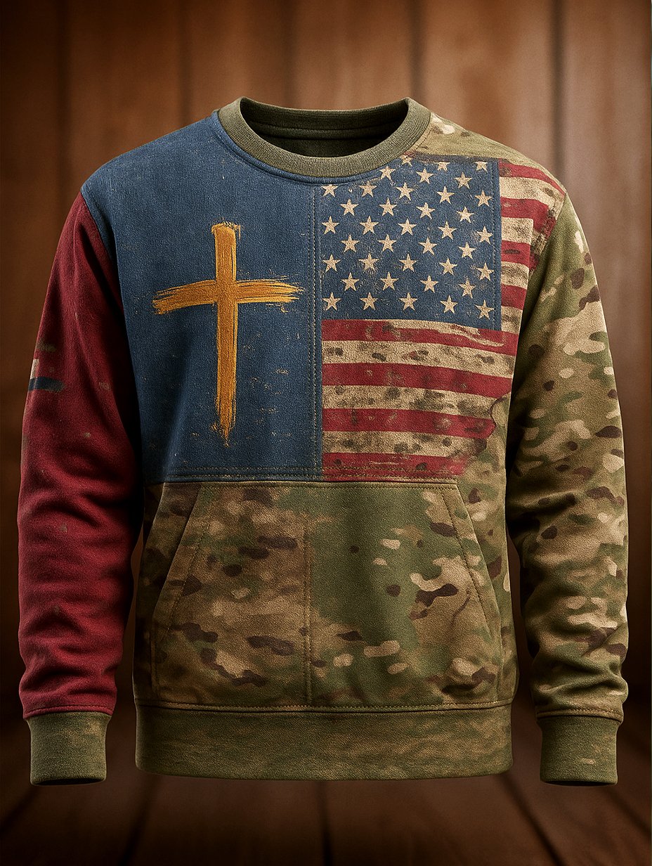 Men's Vintage Casual American Flag Cross Faith Pullover Sweatshirt