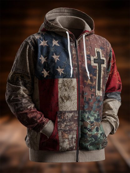 Men's Vintage Casual Faith American Flag Zip Hoodie