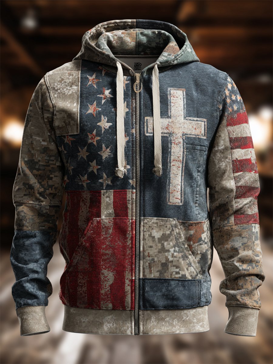 Men's Vintage Casual Faith American Flag Zip Hoodie