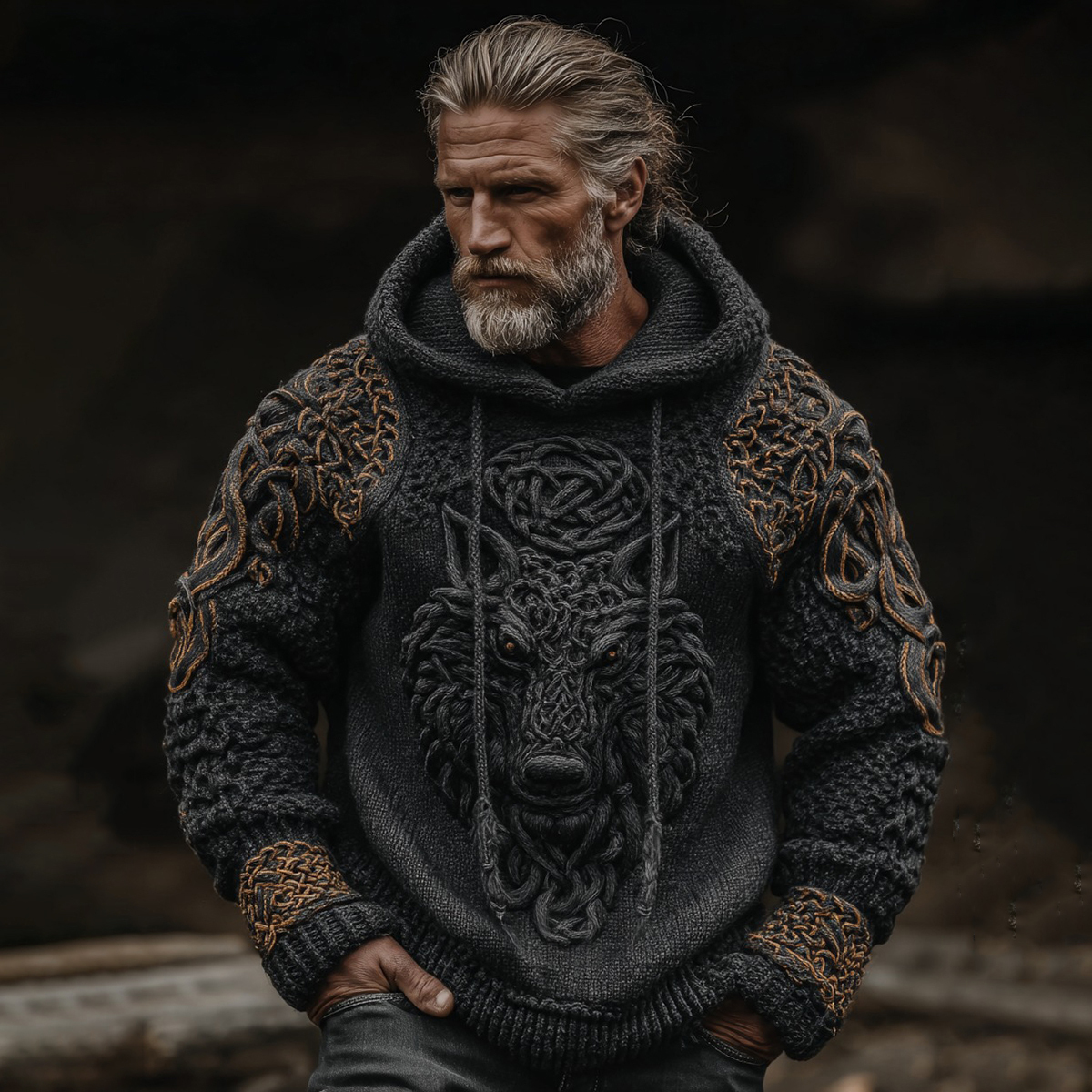 Men's Vintage Viking Wolf Celtic Art Knit Hooded Sweater
