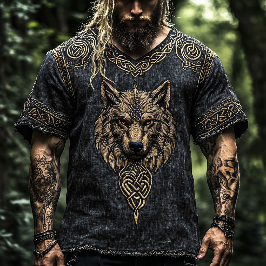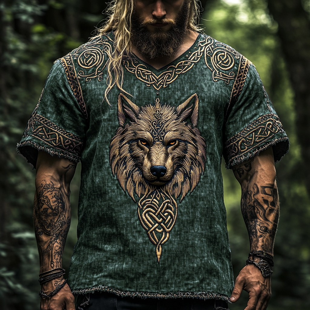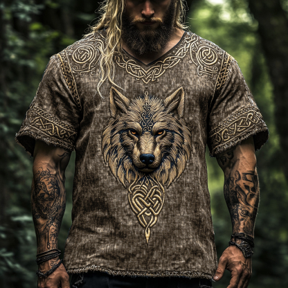 Men's Vintage Viking Wolf Print V-neck Linen Blend T-shirt