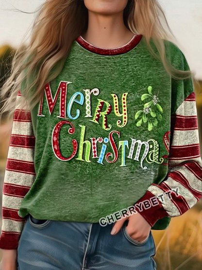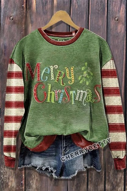 Merry Christmas Print Striped Long Sleeve Sweatshirt