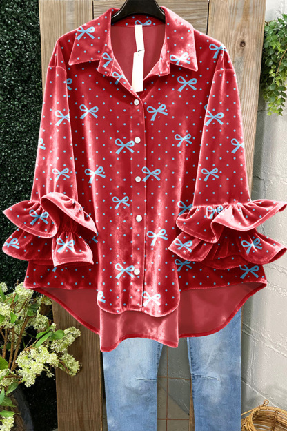 Velvet Christmas Polka Dot Bow Ruffle Top