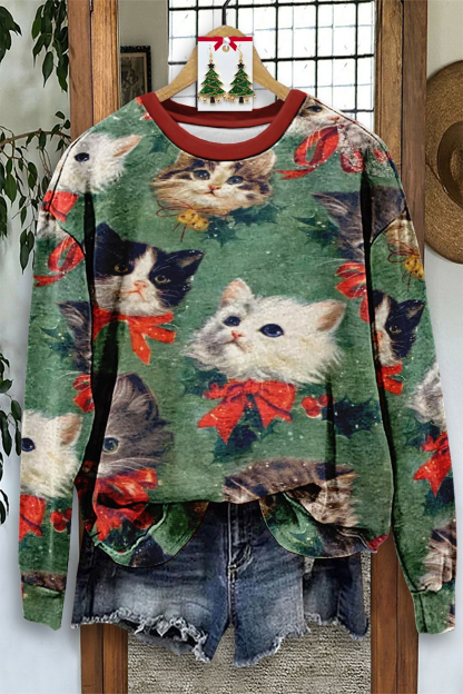 Retro Cute Christmas Cat Print Sweatshirt