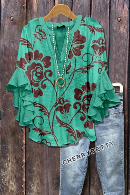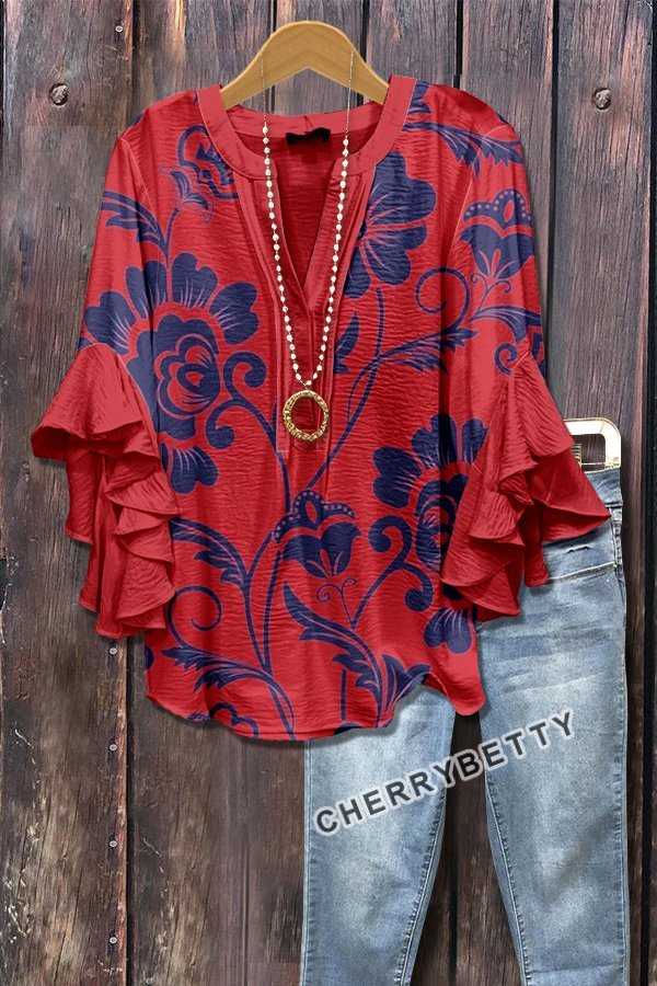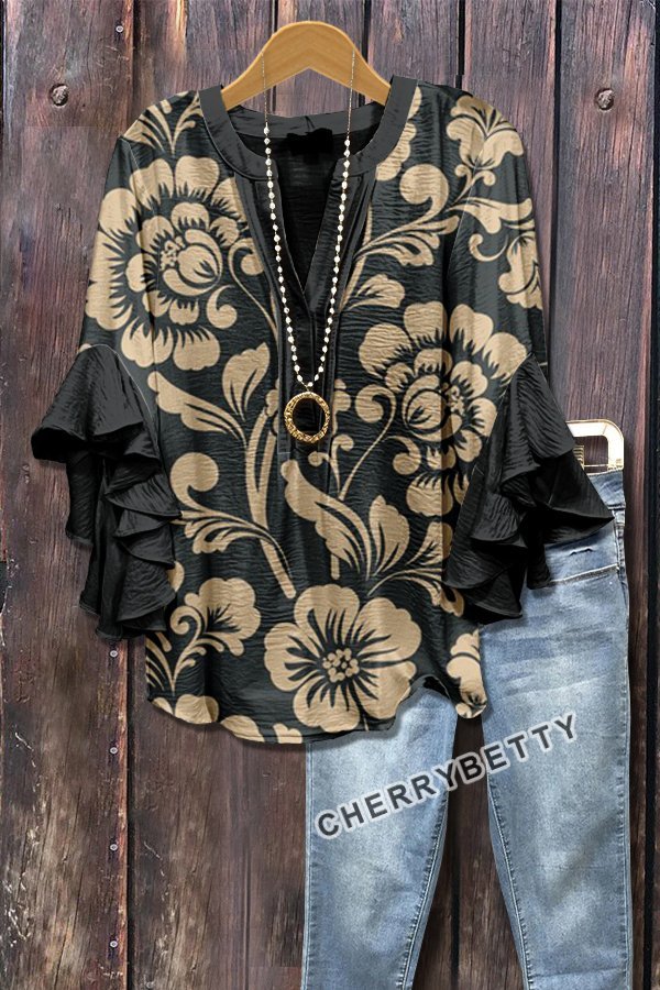 Retro Floral Print Layered Ruffle Sleeve Top