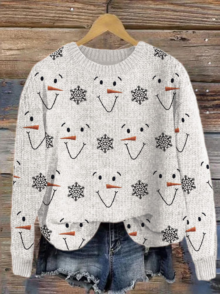Snowman Faces & Snowflakes Embroidered Cozy Knit Sweater