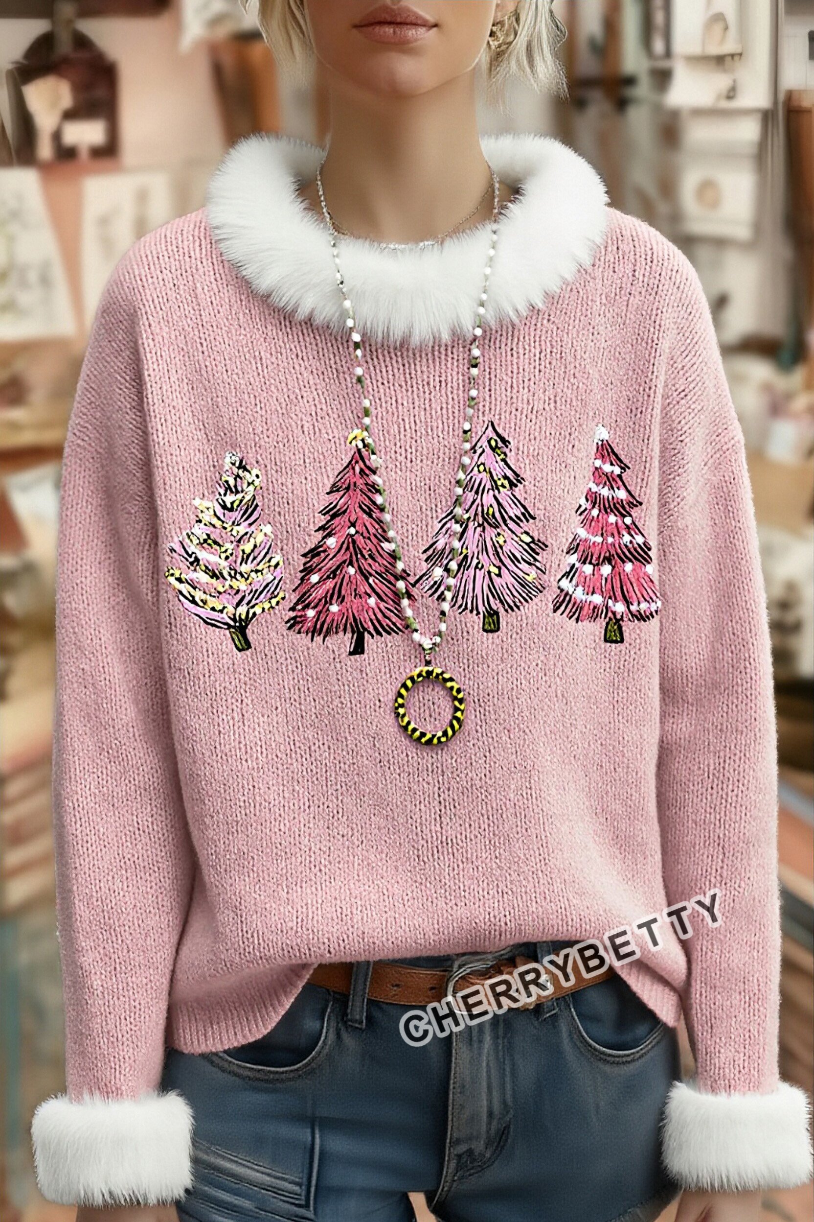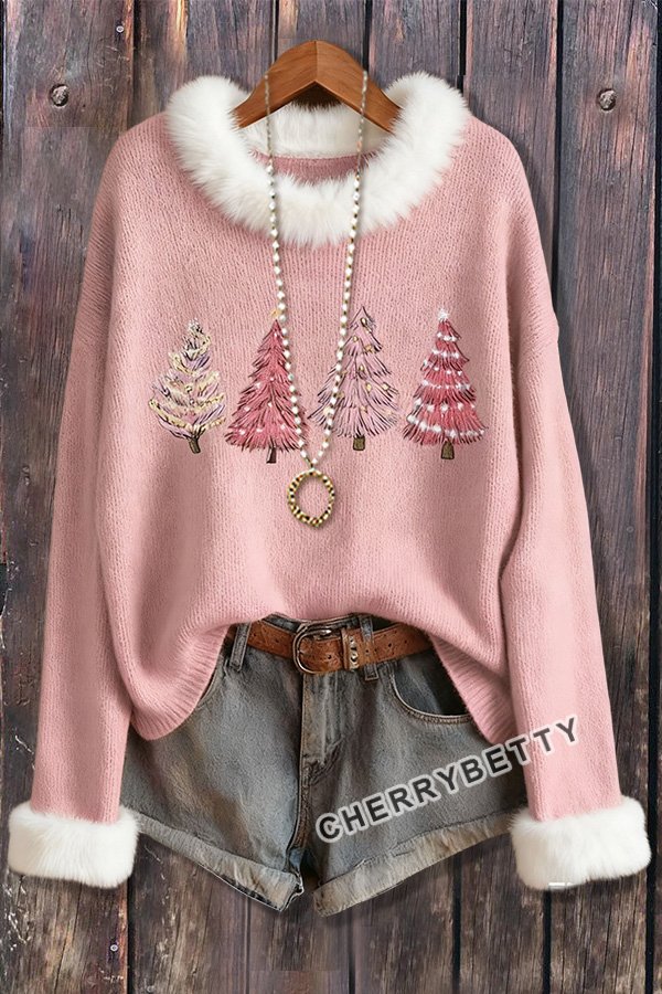 Sweet Christmas Tree Embroidered Long Sleeve Sweater