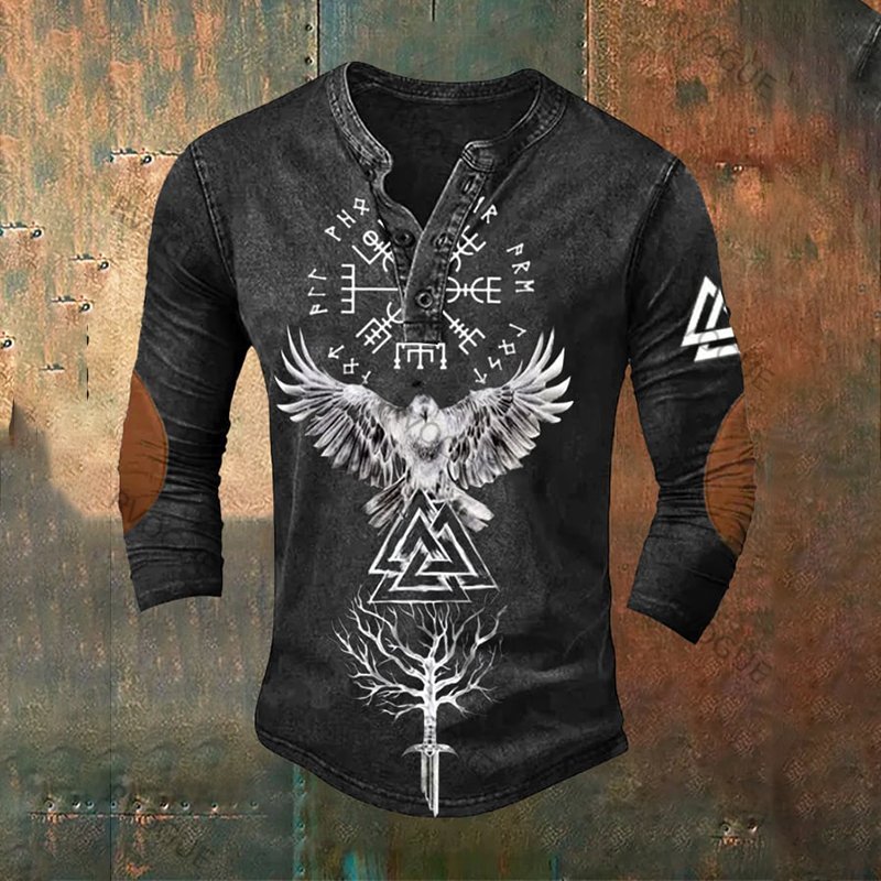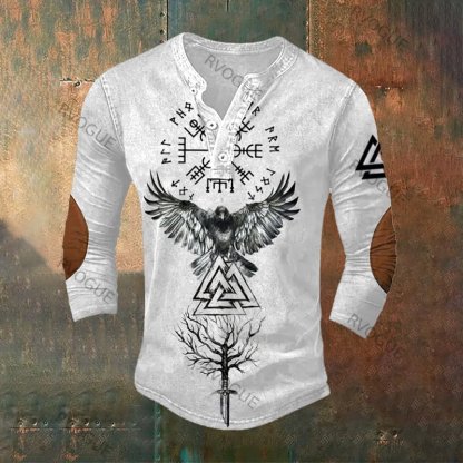 Tribal Viking Bird Graphics Henley Collar Long Sleeves T-Shirt