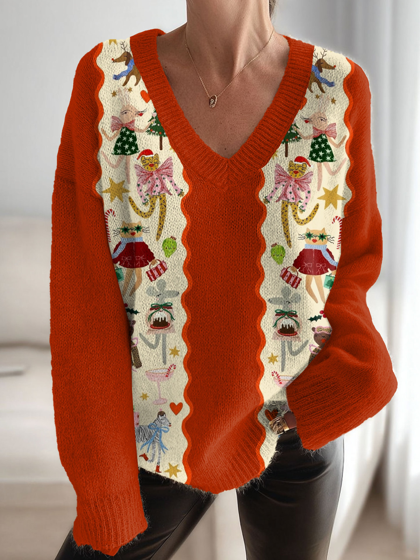 Vintage Christmas Animal Art Print Knit V-neck Pullover Sweater