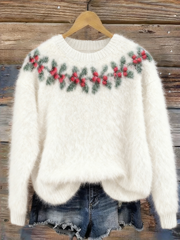 Vintage Christmas Berry Yoke Crochet Cozy Sweater