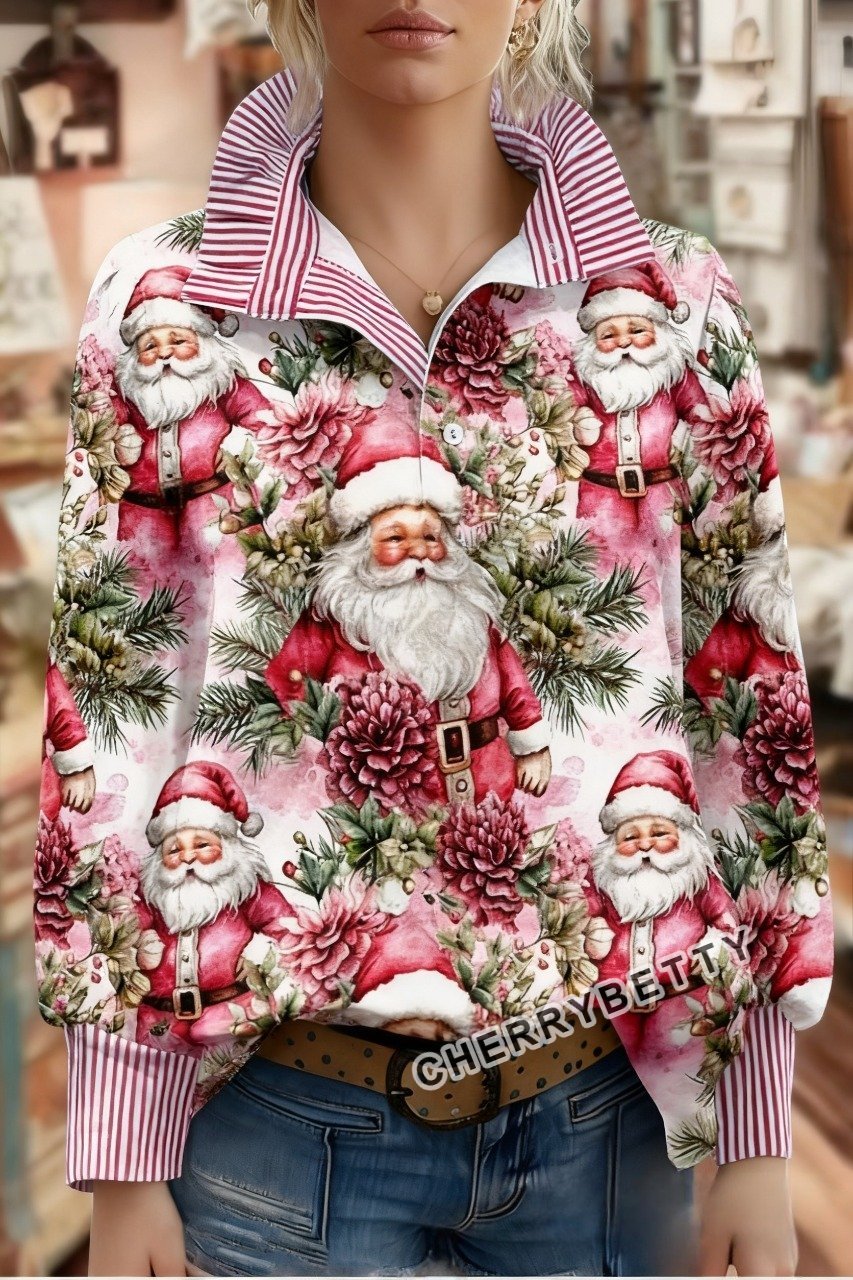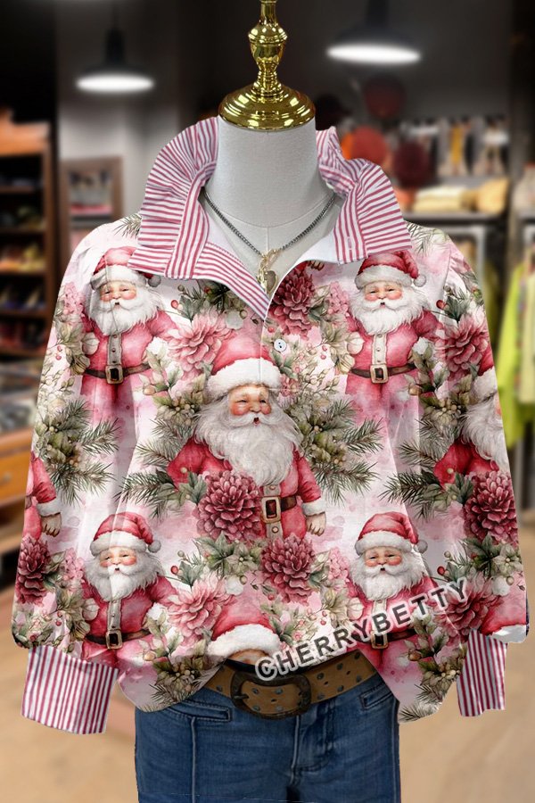 Vintage Christmas Santa Print Striped Long Sleeve Top