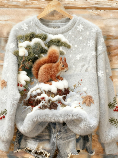 Vintage Christmas Squirrel Snow Scene Art Women's Cozy Plush Sweater