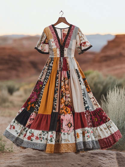 Vintage Floral Patchwork Art Pattern Art Midi Dress