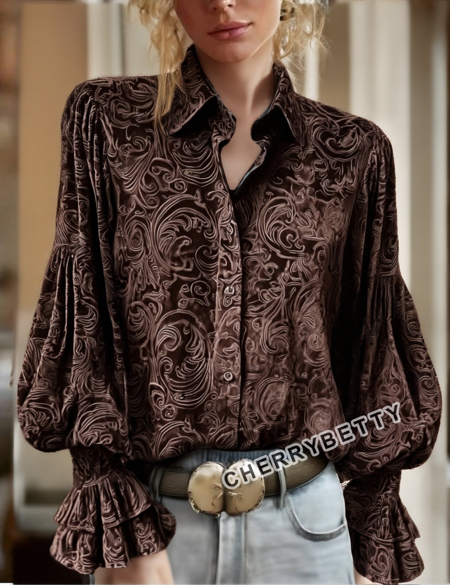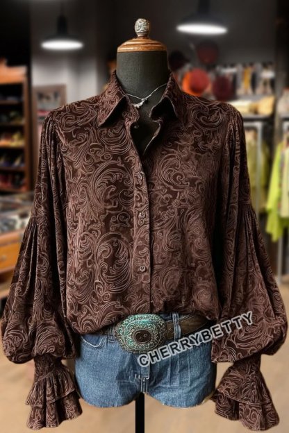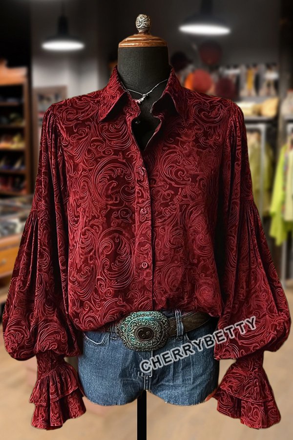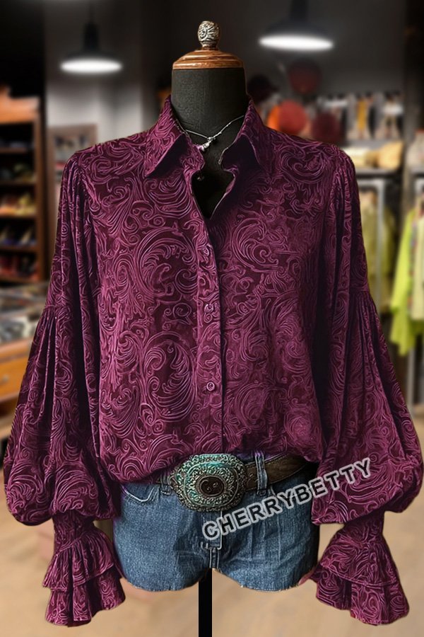 Vintage Floral Print Lantern Sleeve Velvet Top