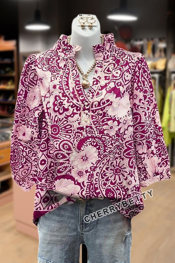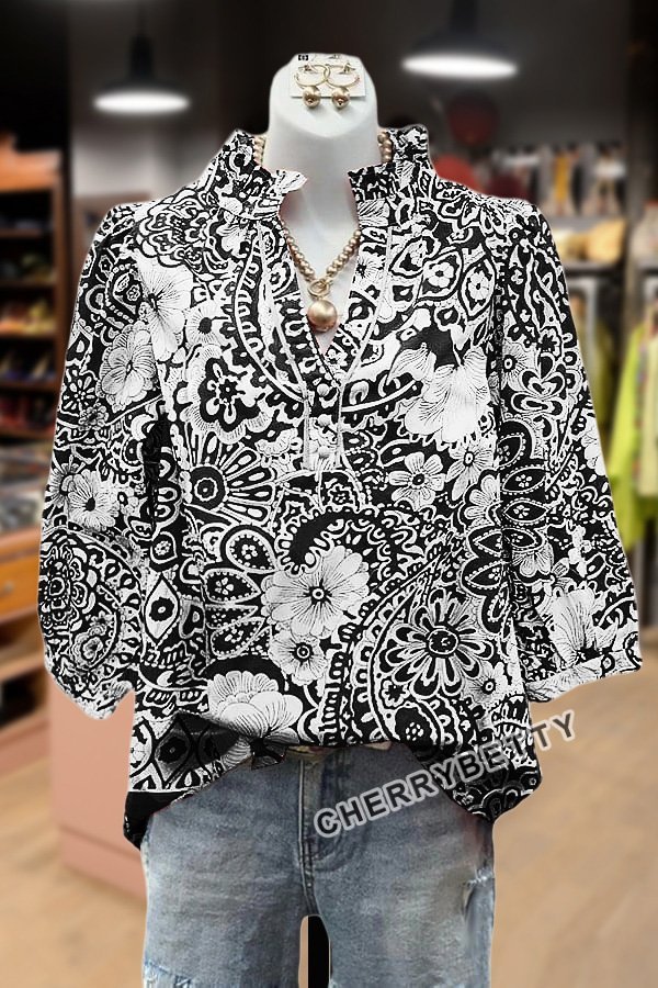 Vintage Floral Print V-Neck Puff Sleeve Top