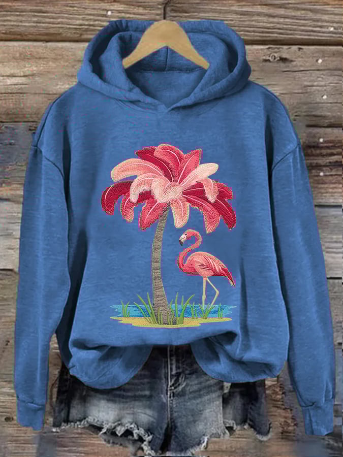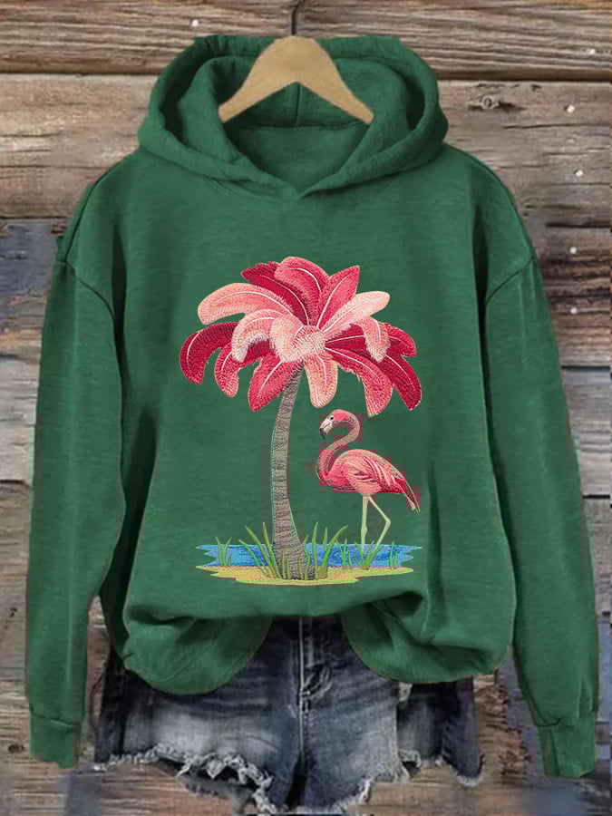 Women's Embroidered Christmas Flamingo Print Hoodie