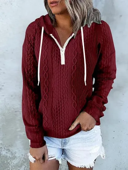 Women's Casual Hooded Twisted Texture Half-zip Sweatshirt