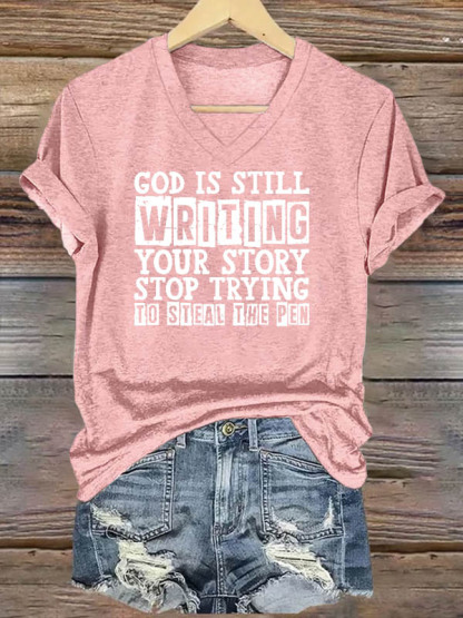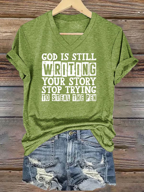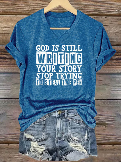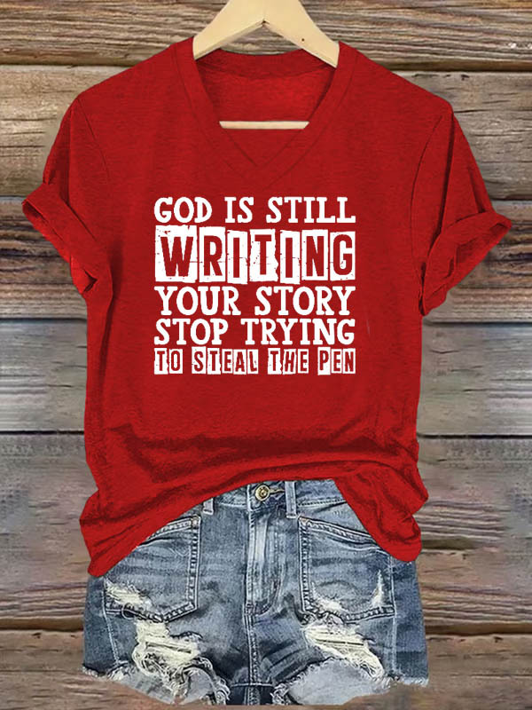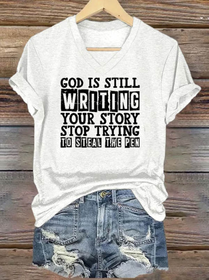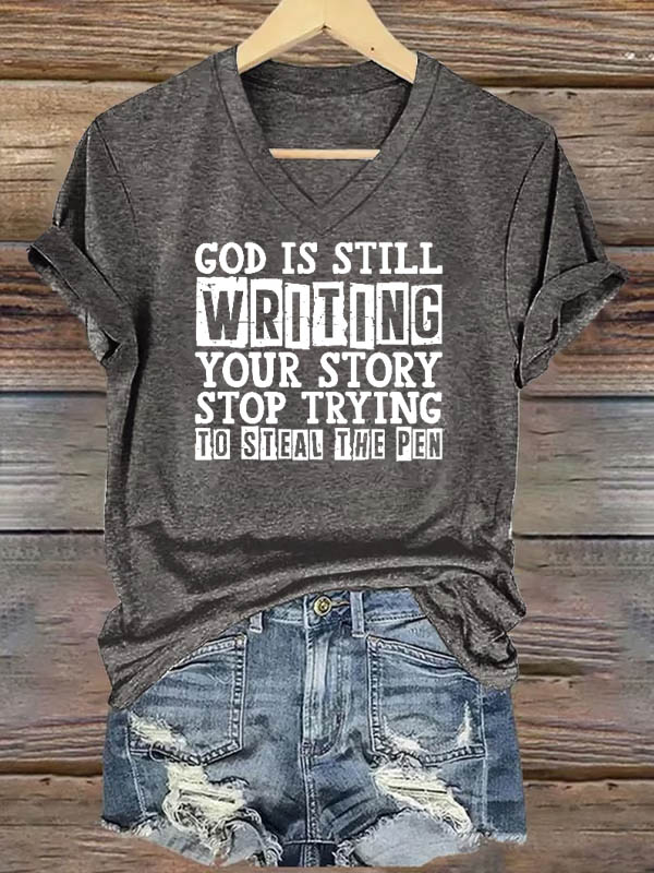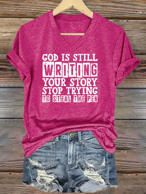 Women's God Is Still Writing Your Story Stop Trying To Steal Pen Pattern Print V Neck Casual T-Shirt