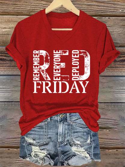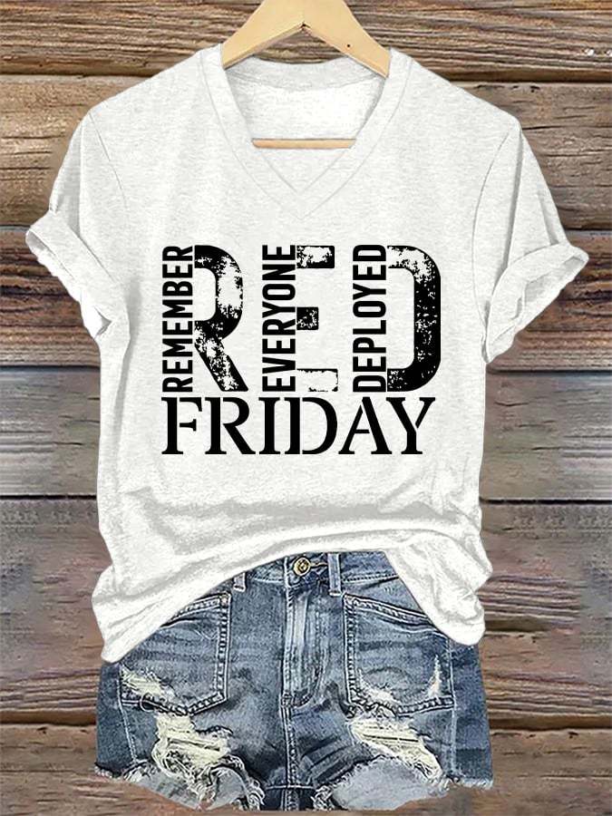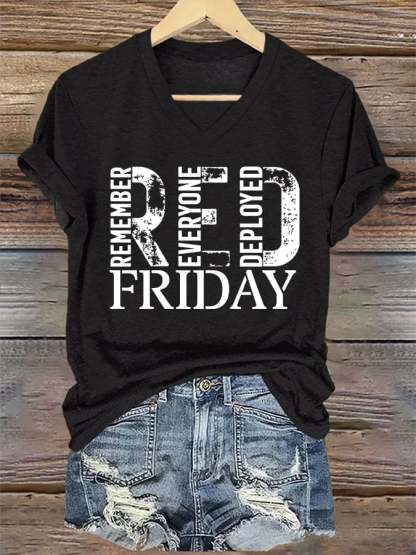 Women's On Fridays We Wear RED Remember Everyone Deployed Print V Neck T-shirt