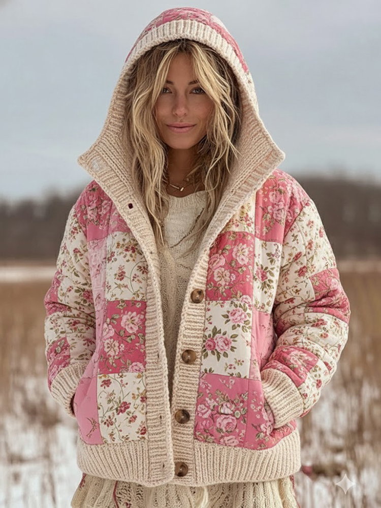 Women's Retro Floral Patchwork Comfortable Hooded Knitted Sweater