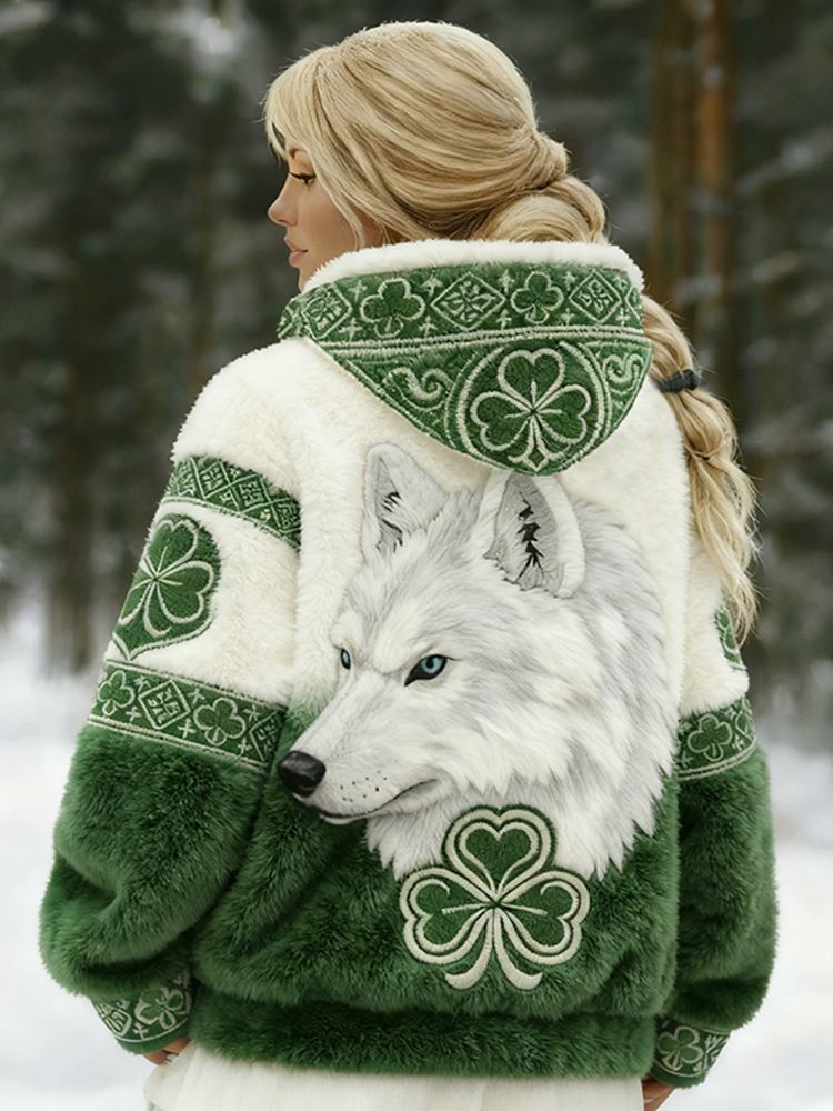 Women's St. Patrick's Day Clover With Wolf Print Zipper Flannel Hoodie