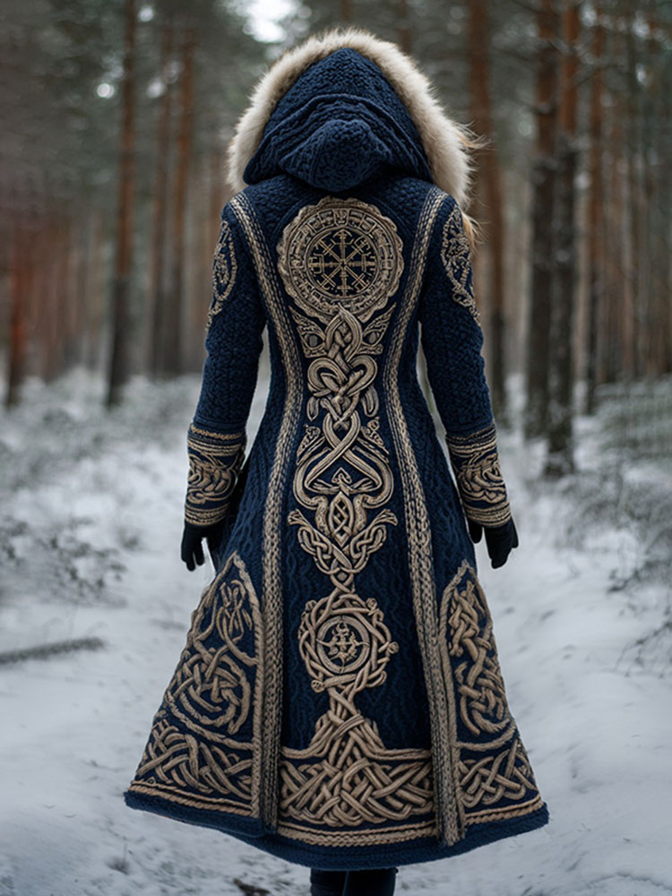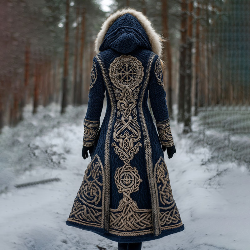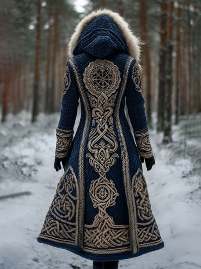 Women's Viking Rune Celtic Knot Knit Fuzzy Maxi Hooded Cardigan