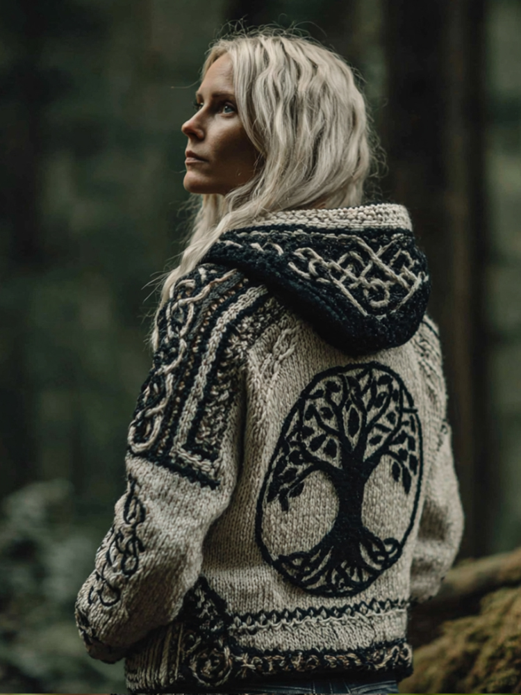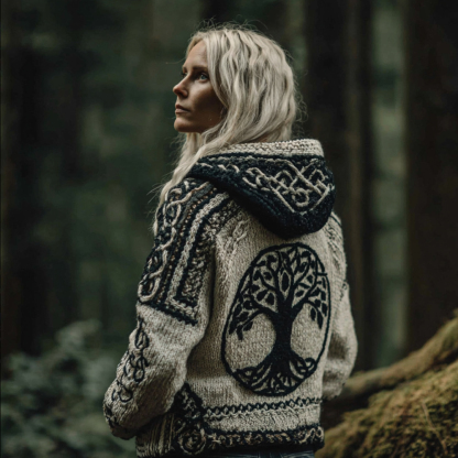 Women's Viking Style Tree Of Life Flat Embroidered Hooded Sweater
