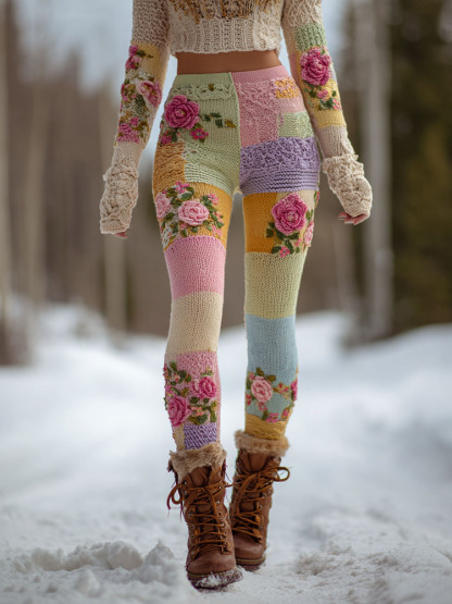 Women's Vintage Floral Patchwork Cozy Knit Leggings
