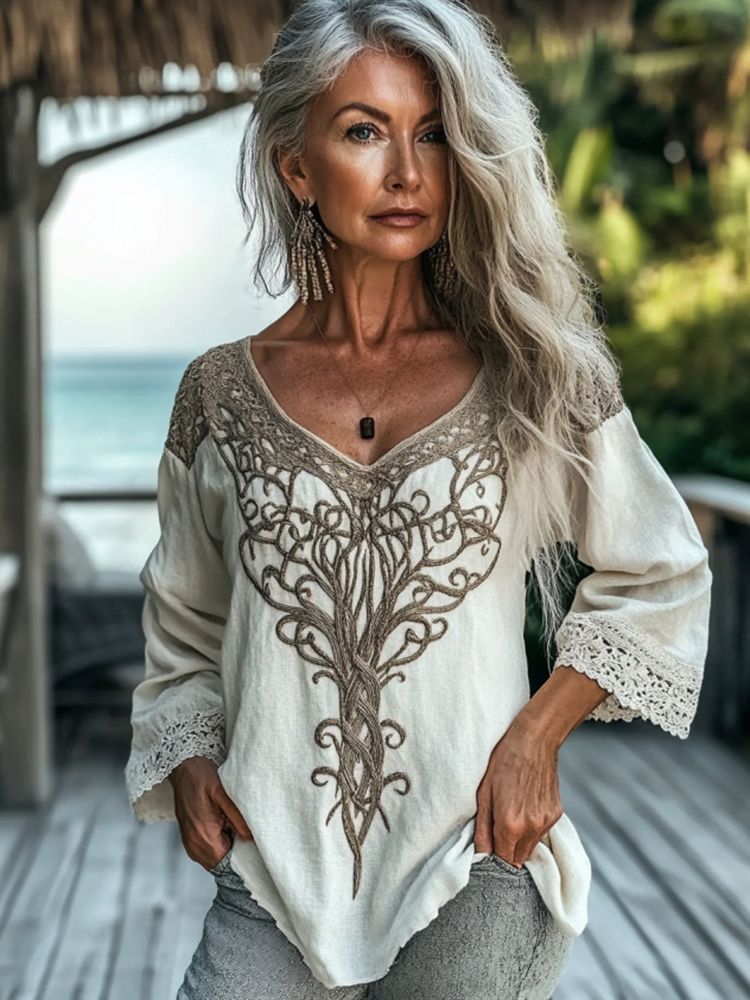 Women's Vintage Tribal Celtic Knot Lace V Neck Linen Shirt