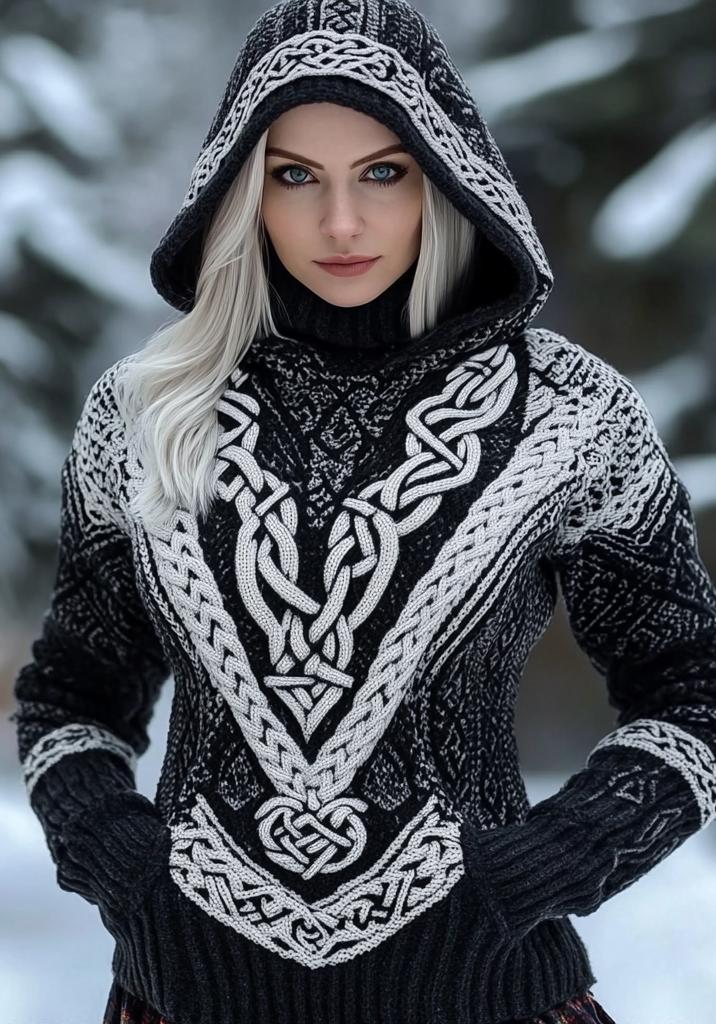 Women's Vintage Viking Celtic Jacquard Chunky Hooded Sweater
