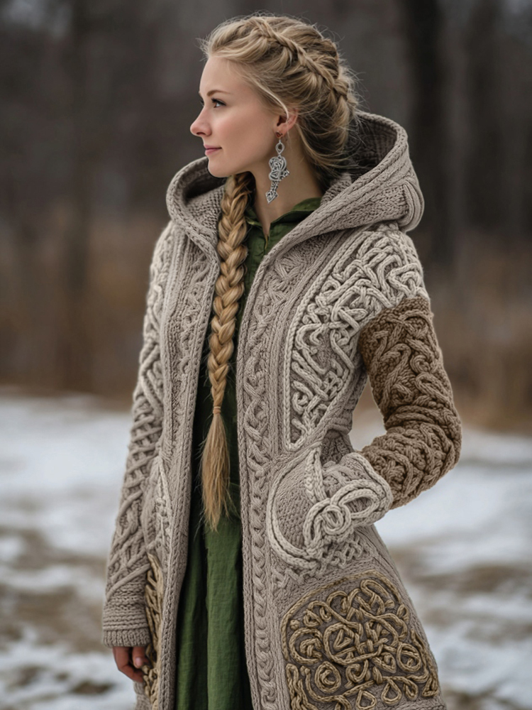 Women's Vintage Viking Celtic Knit Cozy Zipper Pocket Sweater Jacket